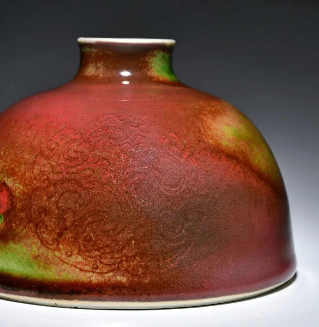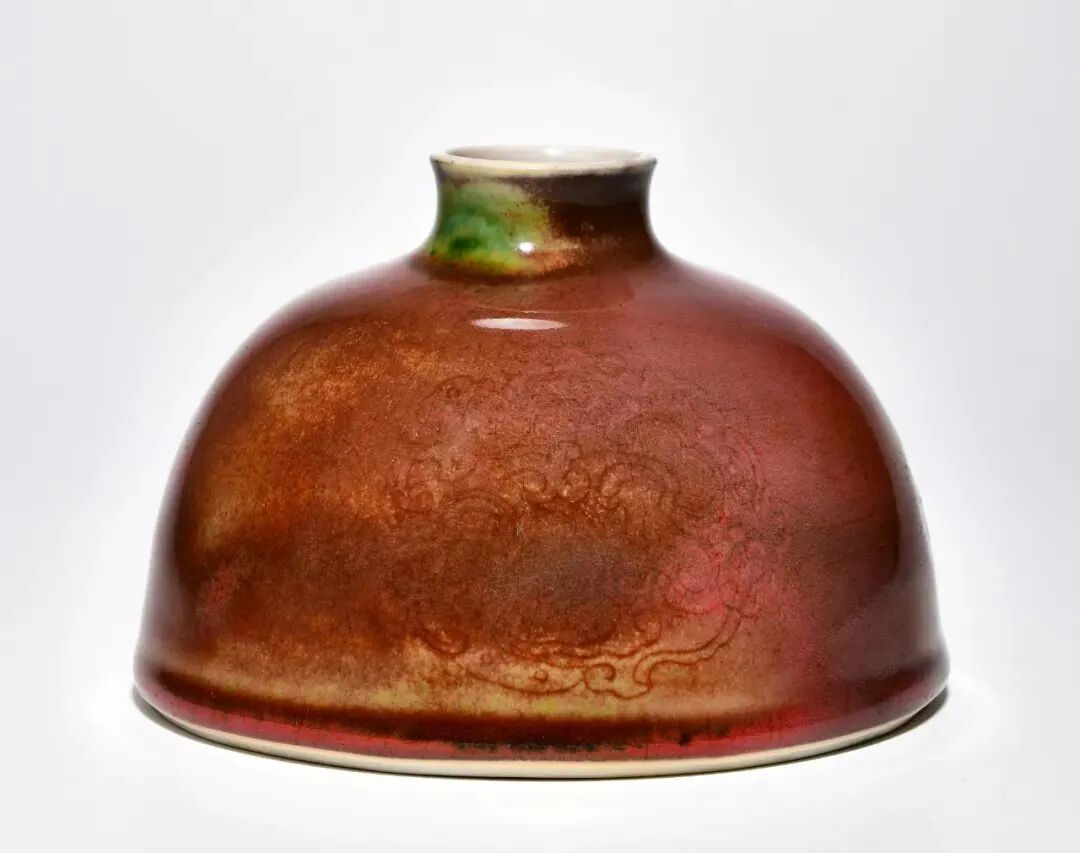 太白尊是文人及帝王将相的高级文具,文人浪漫,将其形比附唐代诗人李白醉卧的样子,故得此名。在文房中它可以装水,可以浸笔,其窄颈便于移动,小口又使尊内水不易洒溅。此器虽为红绿,但兼具含蓄之美是它的极妙处。这还表现在它的纹样上。其腹部暗刻的三团螭暗影影绰绰,纹饰古雅,仿似神物。这若有若无之间,螭龙所具有的王者气派得到了秘响旁通式的体现。