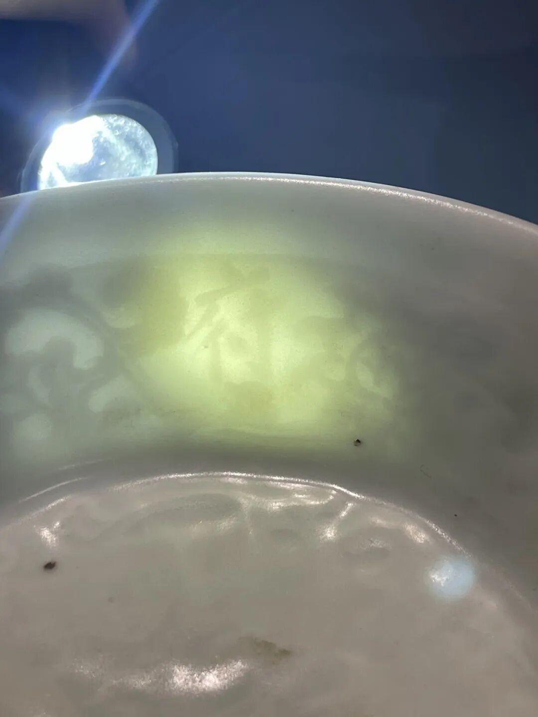 明卵白釉印花卉纹“枢府”款折腰碗局部的“府”字