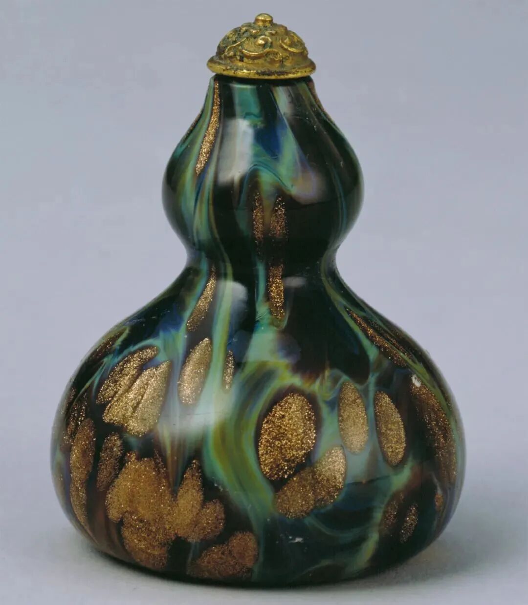 更进一步的,中国传统水墨画中的轻盈流动感被宫廷工匠以搅玻璃之法呈现。如下面这只清乾隆搅玻璃葫芦式烟壶,蓝、深红、赤、淡绿、淡黄、褐等色玻璃搅制成不规则的自然纹理,其间点缀片状金星,光彩熠熠,华美异常。