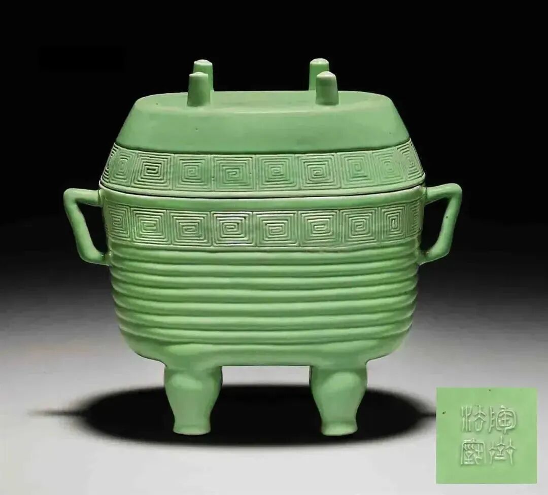 清光绪 浅绿釉仿古“周京叔簋”字弦纹四足盖炉。款识:有“周京叔簋”、“陶斋法宝”四字款,为端方定制仿青铜器家藏陈设瓷。纽约佳士得2011年拍卖,成交价4.625万美元
