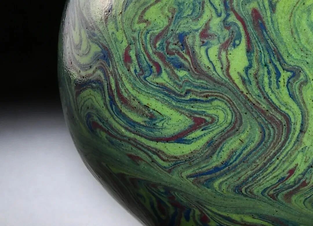 陶瓷绞胎器虽在唐代便有,但色彩较为单调素净。而此乾隆瓷仿搅胎玻璃器明显风格近玻璃而瓷器,可视为乾隆朝瓷业成就最高的仿生瓷之一类(著于乾隆三十九年之前的《陶说》中述:“戗金、镂银、琢石、髹漆、螺甸、竹木、匏蠡诸作,无不以陶为之,仿效而肖”)。