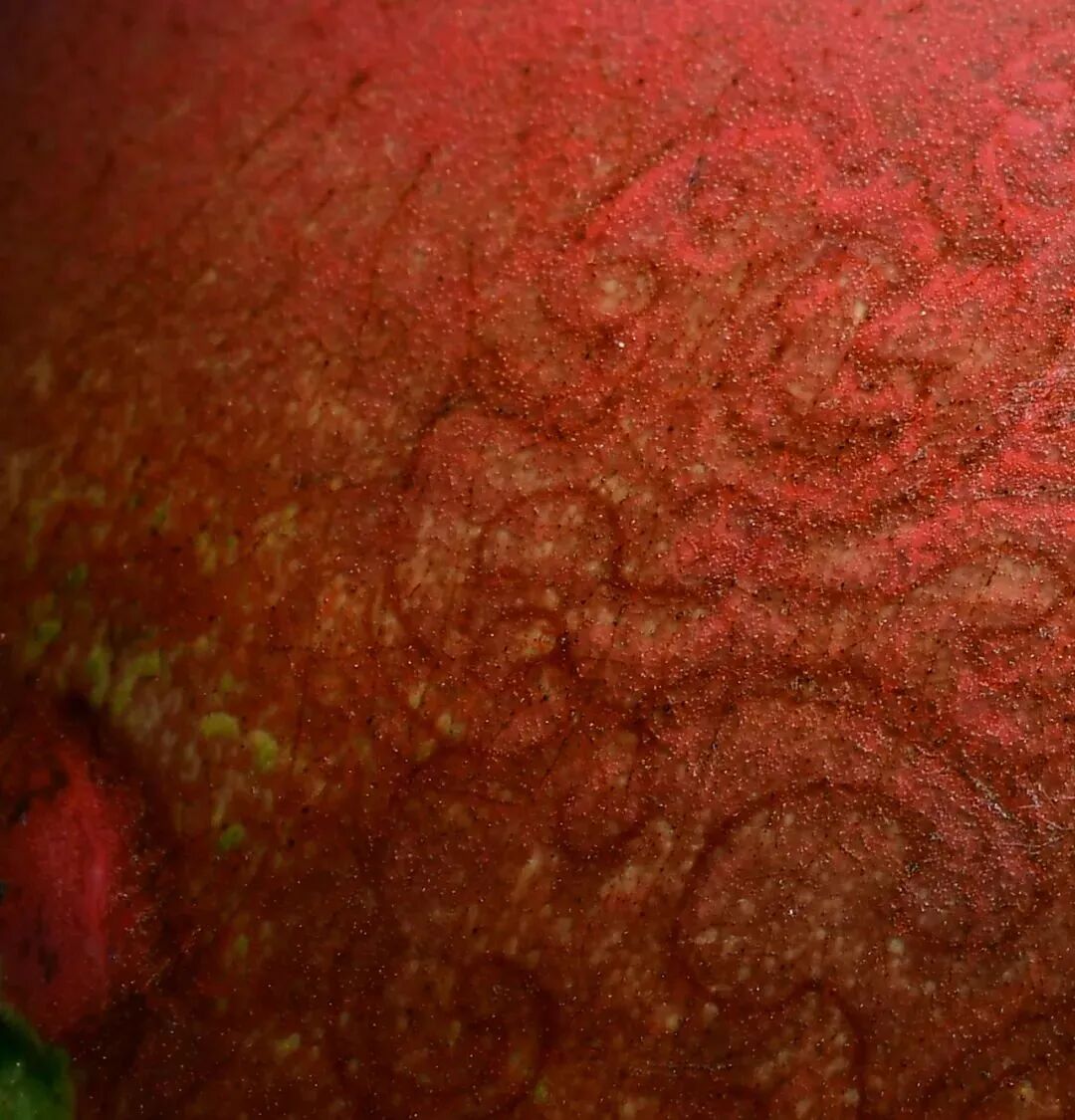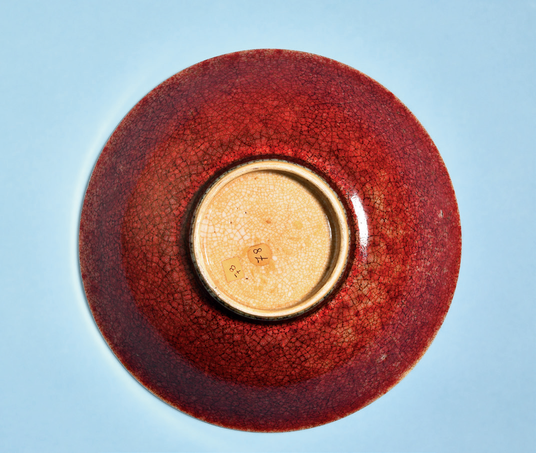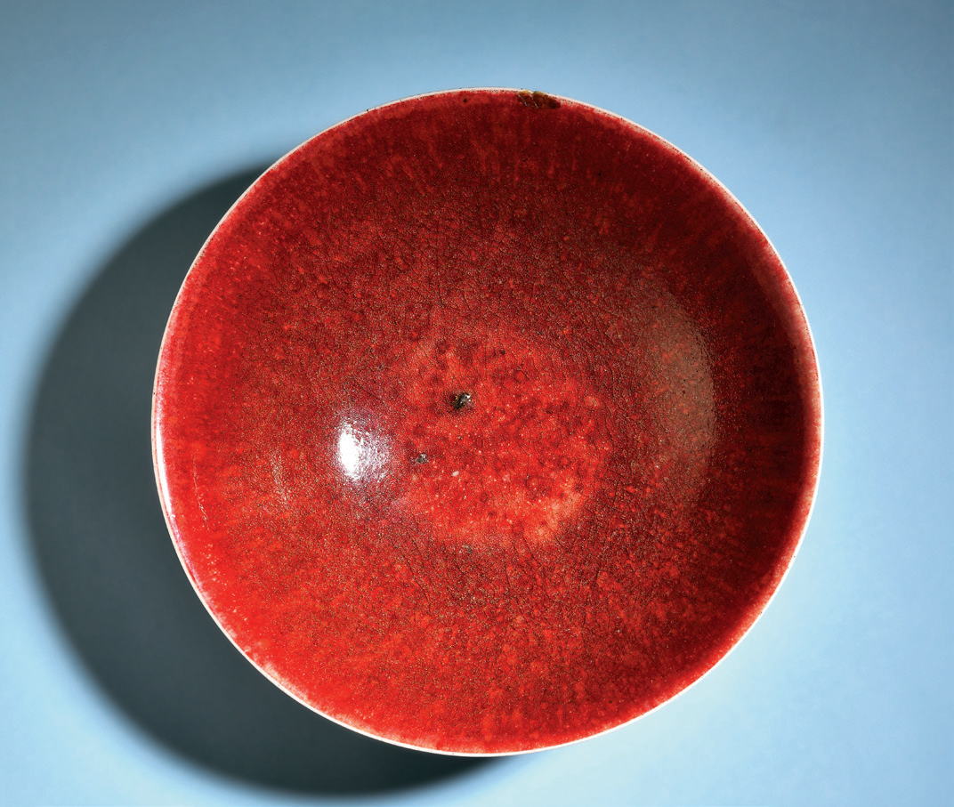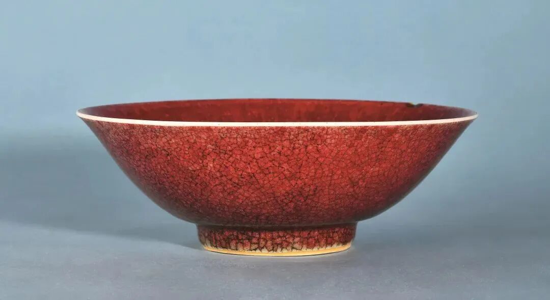 此红肌理丰富,气泡、牛毛纹、开片、内层的丰富质感造就了这片“红色深海”,古代顶级文人的高超审美和窑工的精致技艺让红釉瓷竟仿如红宝石,闪出点点星光,迷人至极。