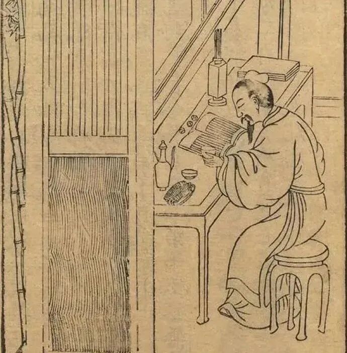 明代 王世贞辑次《有象列仙全传》九卷,此为明万历时期汪云鹏校刊本。此为以琮瓶装盛蓍草茎秆放置在文人的书桌之上的景象在上面《有象列仙全传》书中的描绘