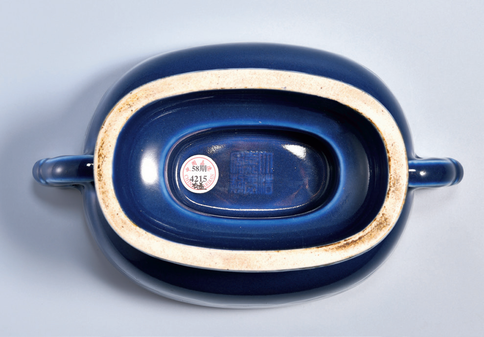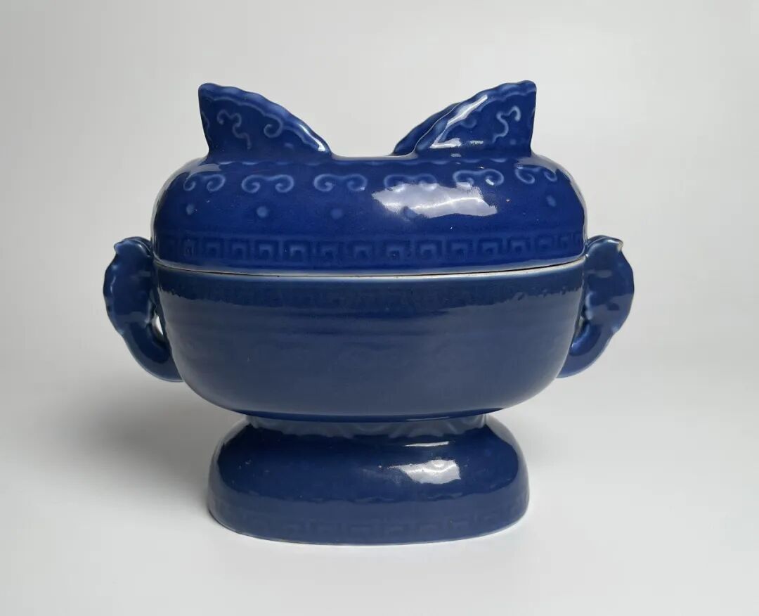 在下面的这种官窑祭蓝釉仿古铜纹簋所施色则为“正色”了,它是清宫用作天坛或祈谷坛祭祀之礼器的,此亦是瓷器“正色”和“间色”的不同用法,色彩不同便区别极大。