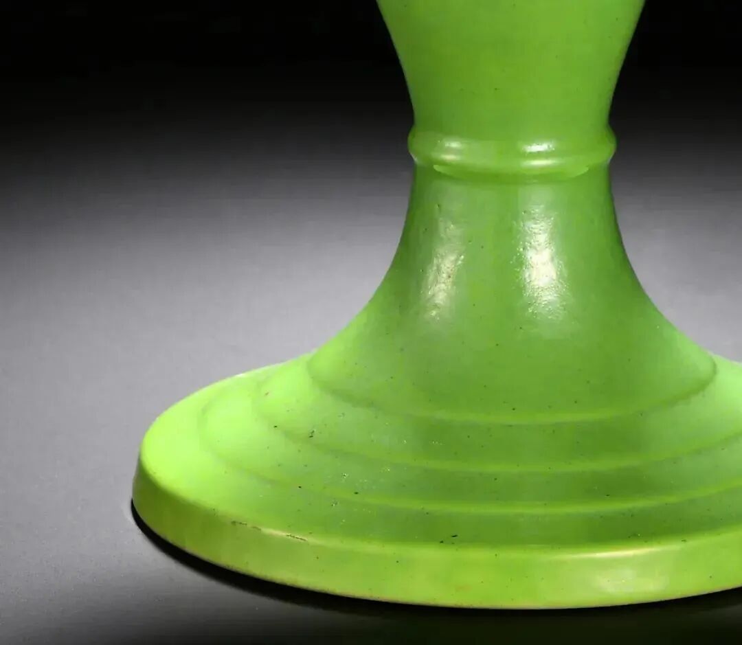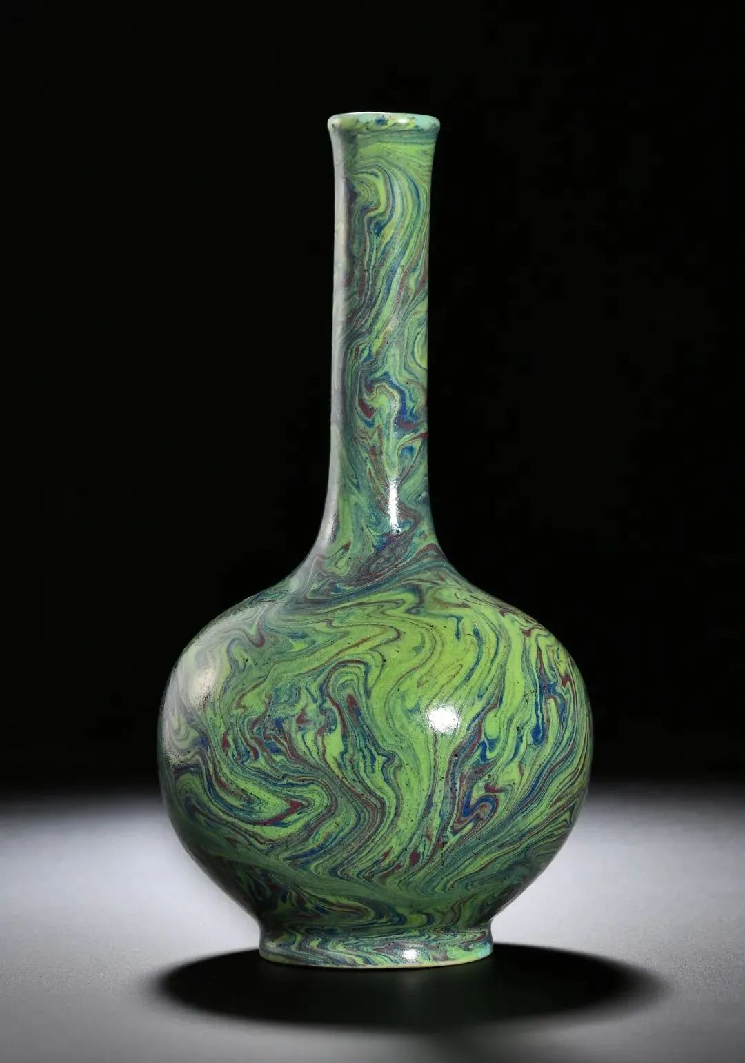 中国一直以来以瓷为重,乾隆时的玻璃工艺得此妙境景德镇的督陶官和瓷工自也不甘示弱,便又衍生出了此时的瓷仿搅胎玻璃作品。圣佳磁臻第五期的这只清乾隆 绿绞釉长颈瓶便是典范之例。