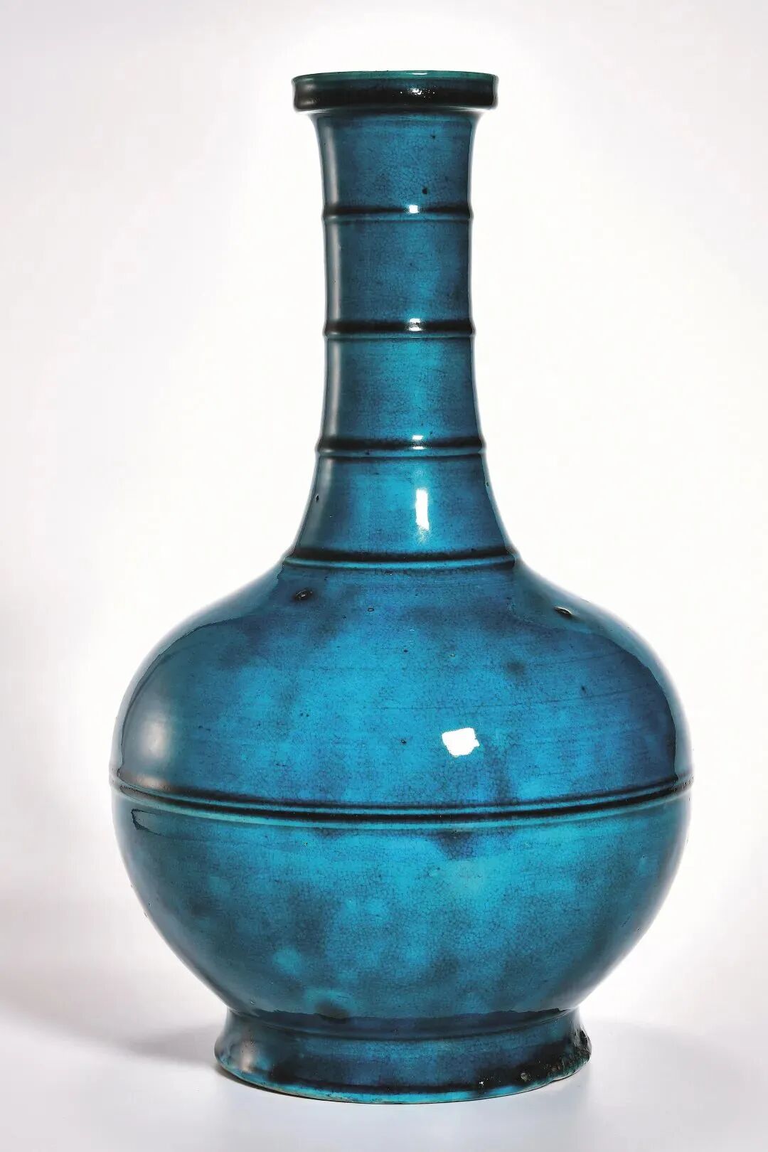 清雍正—乾隆 孔雀蓝釉长颈弦纹盘口瓶
