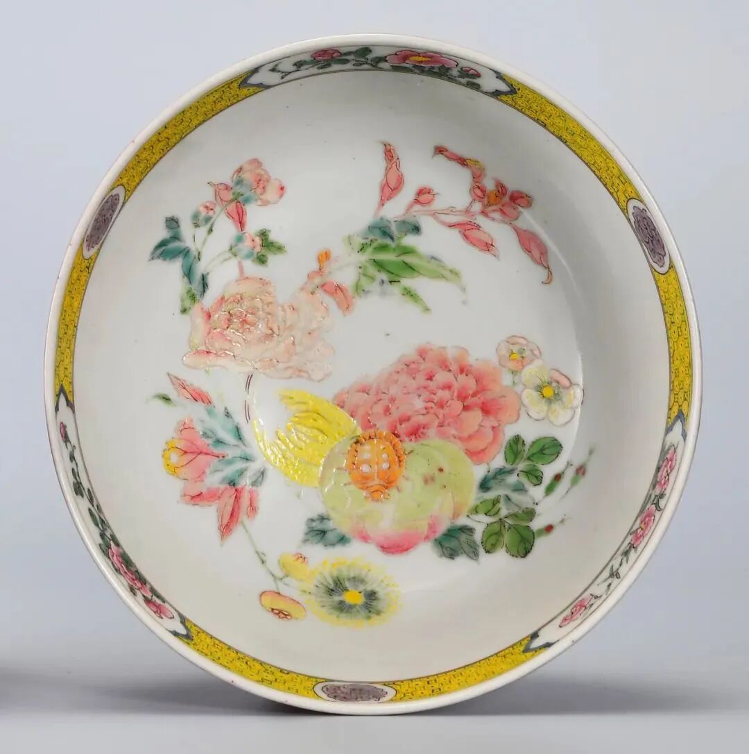 由珐琅彩演化而来的粉彩在雍正期彩料厚实,最具特色。如此碗中所绘的牡丹彩料柔软立体更显富贵。佛手的锑黄和寿桃的粉青渐红也抽象的表现出了福寿之意态。最“点睛”处是寿桃上的瓢虫,此既有“禄”的意思,又静中有动,彰显生命活力。