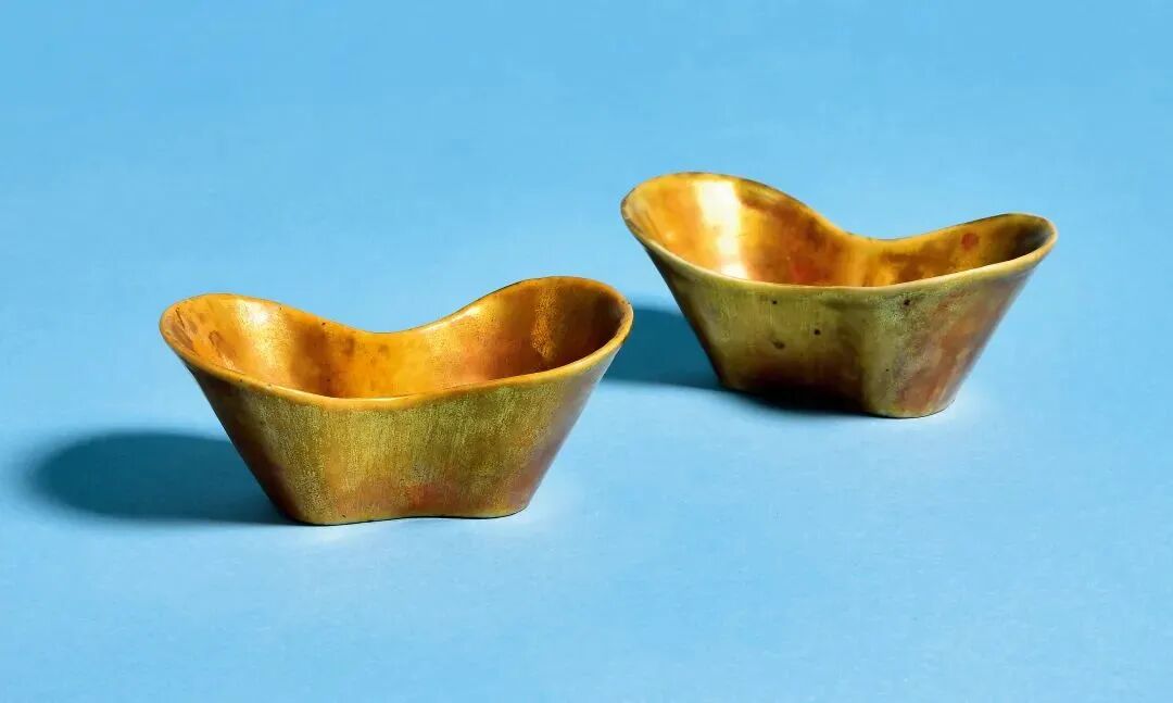 在瓷器方面,金釉瓷由金彩瓷发展而来,清康熙开始出现通体涂金的金釉瓷。在乾隆时期,金釉器物达到极盛,本品便是乾隆时作品。此器形为金元宝,在器型上是权势和富贵的象征,此金釉金元宝化瓷为金,更是财富与品味的结合之象。金釉器的耗金量大,制作难度大,烧制过程需擂金粉、调合金粉、描金、玛瑙刮金 。用金要一笔涂成,水分、温度适宜,工艺不佳金则呈色玫瑰色或紫色。本品黄金光泽纯正,极为杰作。香港收藏家竹月堂简氏藏一金釉银锭形小杯,造型、工艺与本品相似,可资比较。