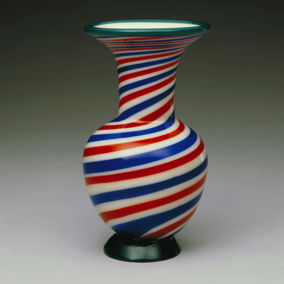 这些独具现代设计感的器物源自皇室和工匠的好奇心,是对陌生领域的勇敢探索。起到开拓之功的是康熙帝,他对西洋的玻璃制品非常感兴趣,下令造办处设玻璃厂仿制,工匠中多有远道而来的西洋工匠,故作品杂糅了中西美学精粹。至乾隆时期,在玻璃装饰工艺上又创新发明了搅玻璃工艺。此工艺类似于拧丝,如上面这件清乾搅玻璃撇口瓶便是一例,其颈、腹部饰白、蓝、红三色相间的条带纹,通体螺旋缠绕,为本来静止的器物注入了勃勃生命力。
