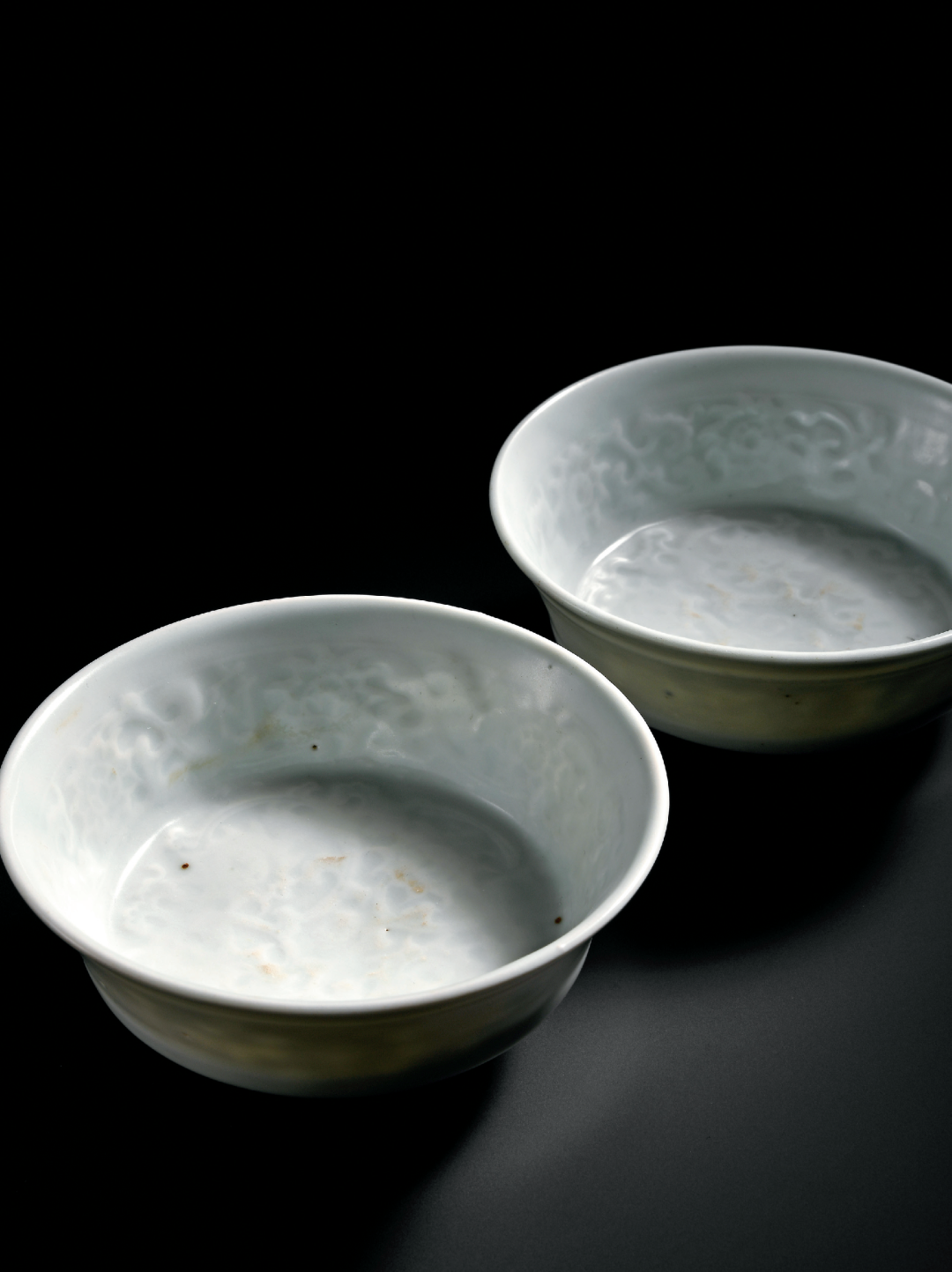 进入清代,白釉器物仍屡受帝王喜爱,不时有追慕唐宋白釉器的慕古之作。如本品通景模印洞石花卉纹,疏朗清新,若隐若现。模印花纹是宋定窑白釉器物的拿手之技,雍正帝多有仰慕,此器便有仿定之感。正如督陶官唐英《陶冶图说》中云:“仿旧须宗其典雅,肇新务审其渊源”。可见,在继承与创新的两相努力下才成就了雍正白釉浅浮雕器皿如此的极高水准。