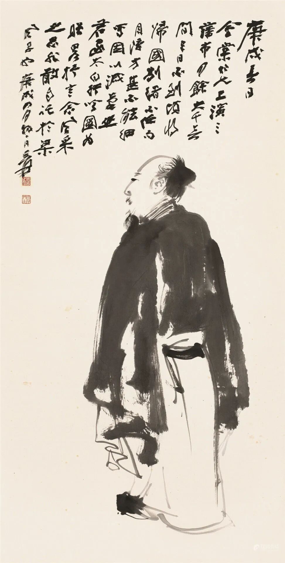 说明:上款人“叔问先生”即郑文焯,自号大鹤山人。光绪元年中举,曾任内阁中书。他工诗词,擅书画,并以词人著称于世,人称晚清四大词人之一。拍品估价:600,000 - 800,000 人民币款识:老髯袒鉅腹,啖兴一何豪。欲尽世间鬼,行路无腥臊。橅离垢居士本。丁亥三月,大石山民唐云记于退思斋。钤印:唐云私印(白)、唐华盦(白)、大石山堂(朱)出版:《中国书画作品集(三)》封面,P283,西泠印社出版社,2012年拍品估价:500,000 - 600,000 人民币款识:苦行头陀沐手敬绘。