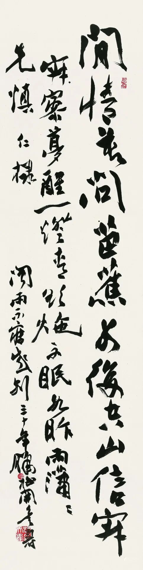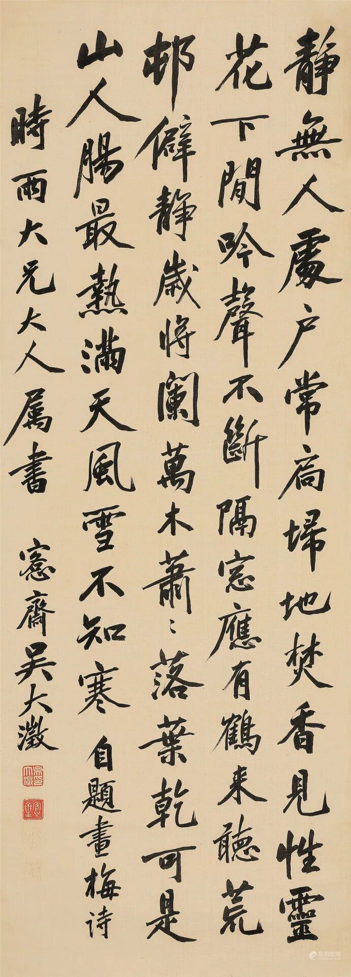 拍品估价:400,000 - 500,000 人民币释文:静无人处户常扃,扫地焚香见性灵。花下闲吟声不断,隔窓应有鹤来听。荒邨僻静岁将阑,万木萧萧落叶干。可是山人肠最熟,满天风雪不知寒。1.《中国明清书画展图录》P82页,光安芳堂1997年2.《中国明清书画展》p40页,门司书作家协会1990年3.《书道》第十一卷第三号,泰东书道院出版部1942年。展览:《中国明清书画展》北九州岛市立门司文化中心,日期:1990年7月20日-7月24日。说明:上款人“时雨大兄”即薛时雨(1818-1885),字慰农,一字澍生,晚号桑根老农。安徽全椒人。清代咸丰三年(1853)进士,授嘉兴知县。太平军起,参李鸿章军幕,以招抚流亡振兴文教为任。官至杭州知府,兼督粮道,代行布政、按察两司事。为台湾第一巡抚刘铭传亲家。晚清著名词家之一,作品有《藤香馆诗删》《词删》等。与著名词家并画家周闲、书法家秦光第、画家应宝时、《寒松阁谈艺琐录》作者张鸣珂、道光进士与诗人张保衡(张任庵)及沈濂、著名篆刻家吴传经等广有交游。去官后,主讲杭州崇文书院、江宁尊经书院、惜芳书院等,门生甚众。尺寸:117×29.5 cm(4),约3.1平尺(每幅)拍品估价:300,000 - 400,000 人民币款识: