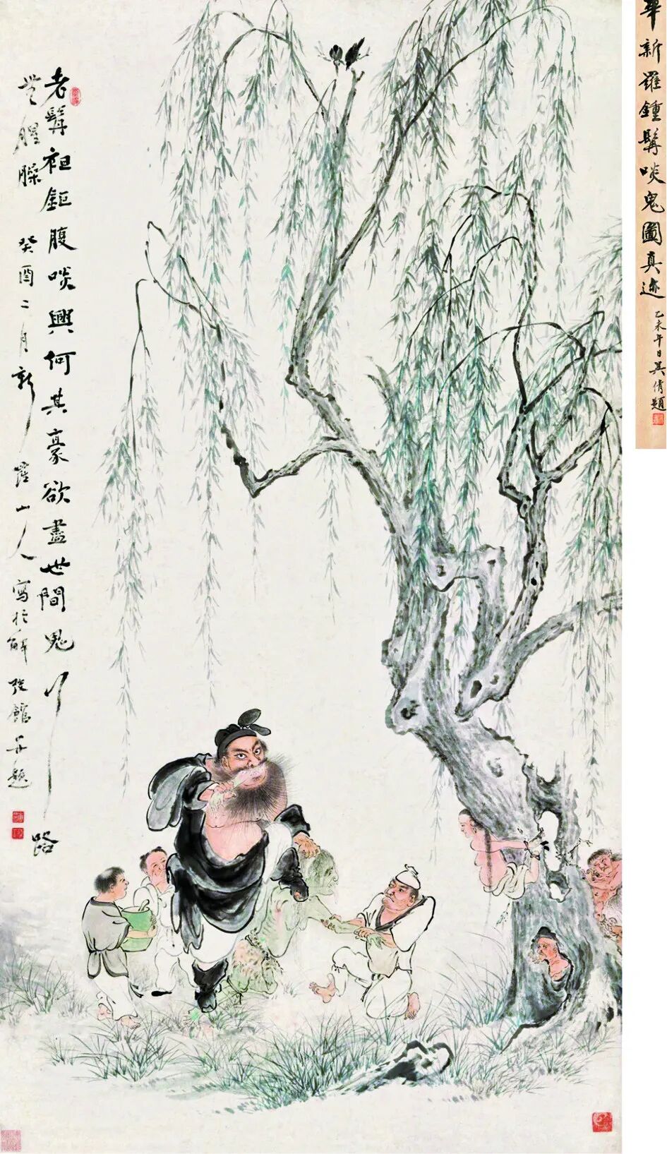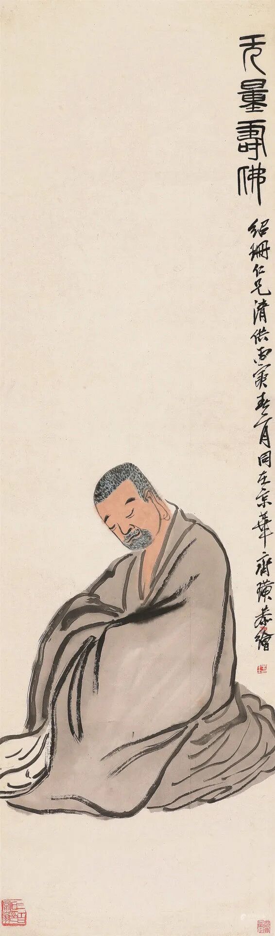 吴昌硕题跋:一亭乘兴画古佛,古佛不类类古仙。眉长二尺爪尺半,奉经持偈心虔虔。专气致柔能婴儿,神游出没崆峒巅。有时骑羊入西蜀,啖以绥山桃实犹垂涎。方瞳灼灼露真相,疑自上天谪偓佺。颜可驻衰骨成玉,享寿已历唐宋难纪年。长生之诀非辟谷,留侯比术玄又玄。仙兮佛兮两无碍,仙能御风佛亦登青莲。老缶今年七十一,跛足耳聋筋力绵。意欲从之游,欢喜生因缘。诵经不熟且面壁,求脱俗骨参真诠。添毫颊上呼欲出,恍对太白胡僧篇。甲寅孟春同客春申浦,吴昌硕题句。【钤印】俊卿大利(白)、昌硕(白)