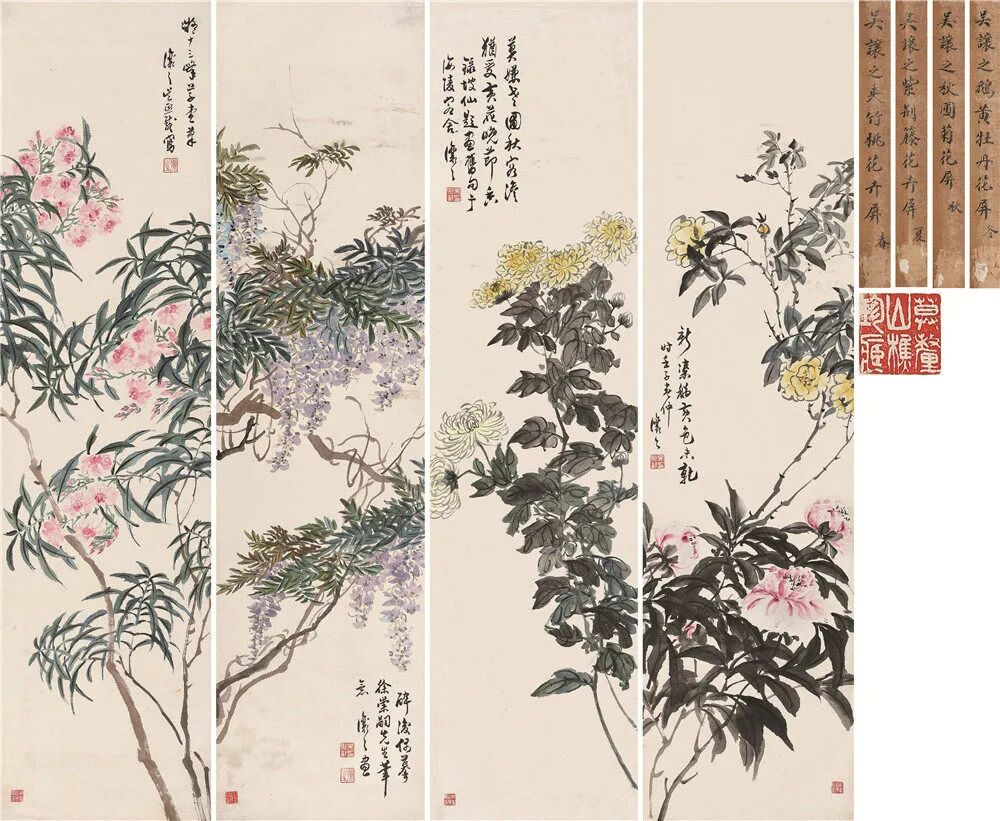 释文:静坐读书各得半日,清风明月不用壹钱。嘉庆乙丑毂雨后二日。来源:香港佳士得2013年春季拍卖会,编号 8291.狄学耕,字曼农,江苏溧阳人。葆贤父。仕江西知县。善画山水,富收藏,王蒙青弁隐居图即为所藏。2.民国时上海著名收藏家吴璧城的旧藏。吴壁城室名来苏楼,与吴湖帆交谊深厚,收藏极为丰富。他曾经营古董文物店,三十年代与其兄吴宾臣频繁出入吴湖帆“梅景书屋”,吴湖帆日记中多见其名。3.应野平,擅书法,以隶书见长。间作诗词,亦清新隽雅。曾为中国美术家协会会员,上海美协常务理事,上海市书法家协会名誉理事,上海中国画院画师。尺寸:183.5×43 cm.(2),约7.1平尺(每幅)拍品估价:600,000 - 800,000 人民币说明:巴黎苏富比春季拍卖会,端方旧藏专场,编号 205拍品估价:350,000 - 450,000 人民币说明:上款人“镕轩先生”即罗佩金(1878—1922),字镕轩,云南澄江人。同盟会员。1909年在日本士官学校毕业归国,先在南宁龙济光部任随营学堂总办,后赴昆明,历任新军第十九镇随营学堂监督及七十四标标统等职。武昌起义后,与蔡锷等光复昆明,旋任南征总统官、军政部长、南防军总司令。1915年底参加护国运动,任第一军总参谋长。尺寸:170×42 cm.(2),约6.4平尺(每幅)拍品估价:300,000 - 400,000 人民币拍品1至15号为李先慎旧藏。李先慎,湖南澧县人,1934年考入湖南长沙私立华中高级艺术师学校开始习画,1939年,毕业于私立华中高级艺术师学校,同年,考入国立杭州艺术专科学校,受教于潘天寿、陈之佛等人,1943年毕业,并留校担任国立杭州艺术专科学校助教,1947年,升任国立杭州艺术专科学校讲师,1948年,赴台。重庆江北区鸿恩寺隧道,是车流密集的交通干道。离隧道口不远处,有个叫黑院墙的地方。抗战时期,<国立艺术专科学校 > 曾于此兴办。这所学校,是中央美术学院和中国美术学院的前身。四年的办学经历,给这片地域留下深深的烙印,黑院墙的名称得以流传至今。本次上拍的十五件作品是当年国立艺专黑院墙时期的美好纪念,也是李先慎学长与潘天寿、吕凤子、丰子恺、关良等名家间互通交友的诠释与呈现,值得深思和回味。拍品估价:80,000 - 100,000 人民币款识:先慎仁棣,闻雨不寐感别,三十年腊梅开侯,寿。释文:闲情莫(复)问芭蕉,别后空山信寂寥。梦醒一灯青欲炧,不眠如昨雨潇潇。Lot 11