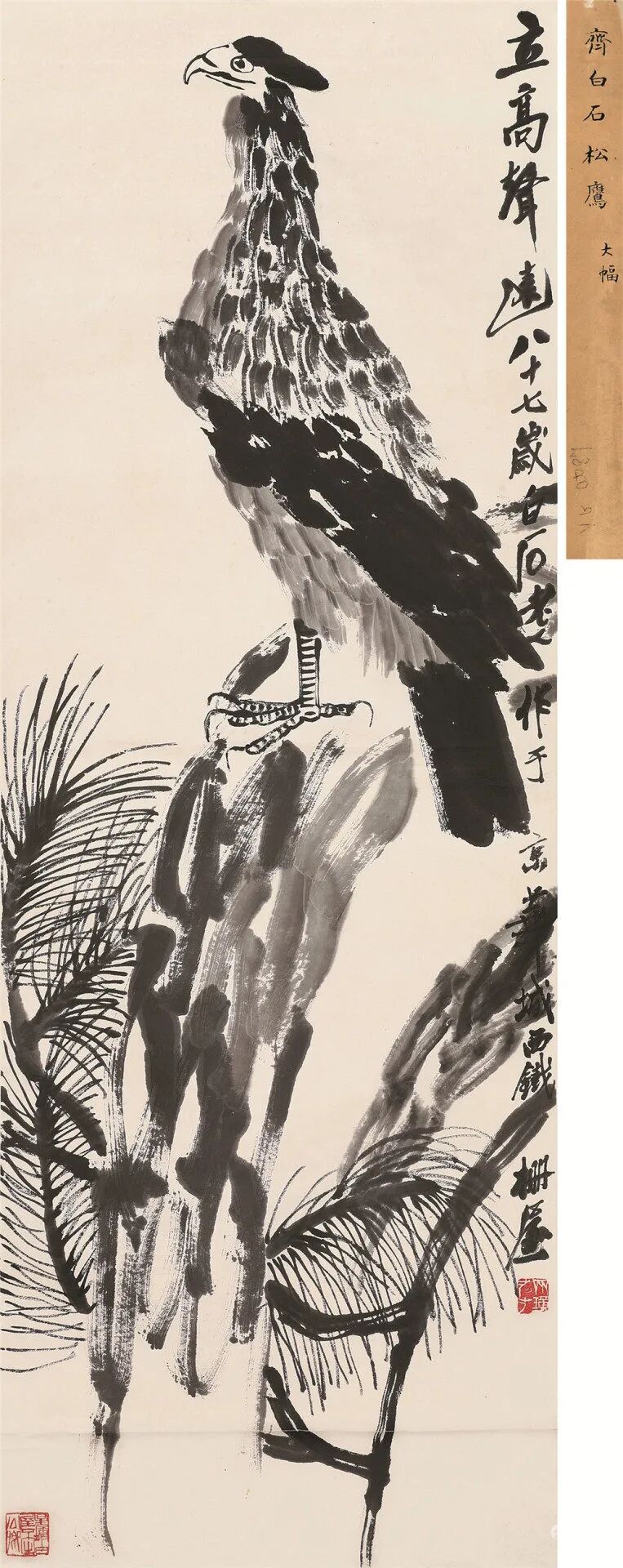 来源:香港苏富比1998年春季拍卖会,编号 2261.《齐白石诗书画印四绝》图25,保利艺术馆2009年;2.《中国画钤印答问》P13,天津人民美术出版社,2011年;3.《藏画真好》P35,吉林出版社,2018年;《齐白石作品珍藏卷》P195湖南美术出版社2010年。说明:邓实旧藏。邓实(1877-1951)字秋枚,一字禀生,别号枚子、野残,别署枚君、鸡鸣,室名风雨楼(藏书楼,有《风雨楼丛书》),影射名邓枚叔(见龙公《江左十年目睹记》)。广东顺德人,寓居上海。藏书家、出版家、学者。光绪三十一年(1905),与同门黄节等组织国学保存会。创办《国粹学报》,宣传国粹主义。后创设神州国光社,出版国学书籍。又与黄宾虹编印《美术丛书》。拍品估价:2,000,000 - 3,500,000 人民币款识:立高声远。八十七岁白石老人作于京华城西铁栅屋。