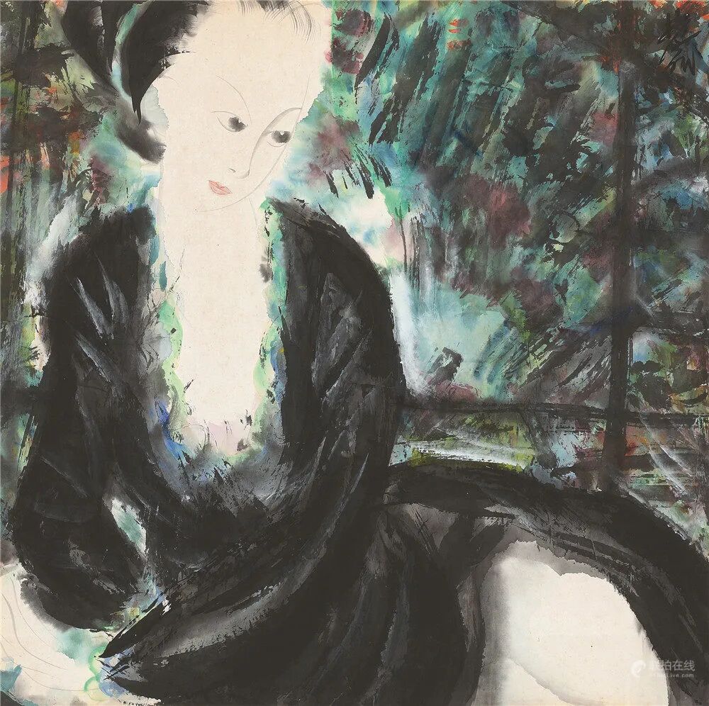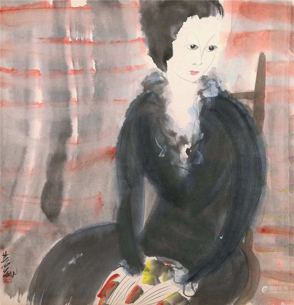 出版:《中国现代主义绘画大师·林风眠》P89,天津人民美术出版社,2005年。说明:画中模特应为是林风眠的夫人爱丽丝·法当,她穿着黑色古典洋装,卷发披肩,颔首侧视,嘴角微翘,带着迷人的浅笑,俨然一位妩媚而摩登的成熟女性。领口处淡淡得蓝色花边,既写意又传神,将半透明的纱质表现得淋漓尽致,具有水彩的效果,是林风眠的独得之秘。林风眠通过自身对西方艺术的学习,将西方的绘画技法运用到中国画的表现之中。他所表现得仕女从根本上改变了传统水墨的面貌,形式上是西画,表现的却是中国画的意境美。拍品估价:1,200,000 - 1,500,000 人民币款识:致明同志正之,陆俨少画。