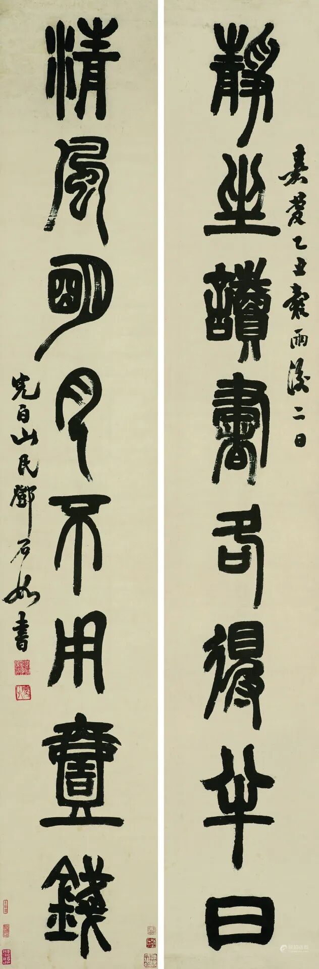 钤印:旧王孙(白)、溥儒(白)、明夷(朱)出版:《师古超尘:溥心畲艺术精品集》p66,寒舍股份有限公司尺寸:203.5×32.5 cm(2),约6.0平尺(每幅)拍品估价:600,000 - 800,000 人民币款识:完白山民邓石如书。