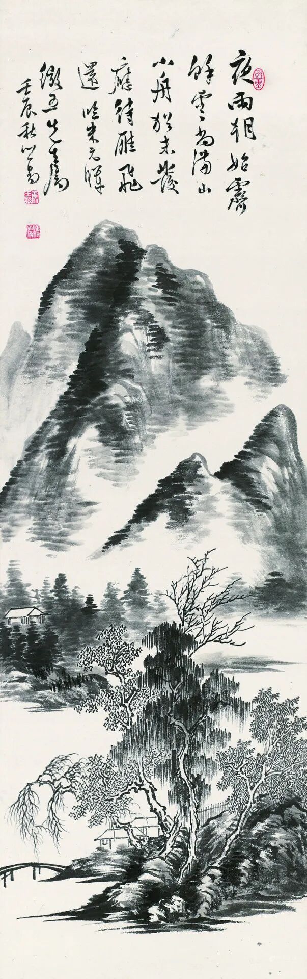 说明:席锡藩(1863-1933)旧藏。席锡藩,本名裕康,字慰根,号莫厘山樵,江苏无锡人,出身于沪上著名买办家族,先后担任英商麦加利银行、华俄道胜银行、中法工商银行等买办,其交游广泛,亦博识多能,曾以“莫厘山樵”之名为《游戏报》撰文,庋藏辑为《颐性室藏唐宋元明清五代名人书画真迹大全》。拍品估价:250,000 - 350,000 人民币2.上款人吴宣南,原为上海美协办公室副主任。与林风眠、谢稚柳、陈佩秋等皆为同事。3.此件作品为韩敏题签条,程十发题引首,陈佩秋、沈柔坚、车鹏飞题尾跋。拍品估价:150,000 - 200,000 人民币款识:夜雨朔始霁,余云尚满山。小舟犹未发,应待雁飞还。临米元晖。征五先生属,壬辰秋心畬。