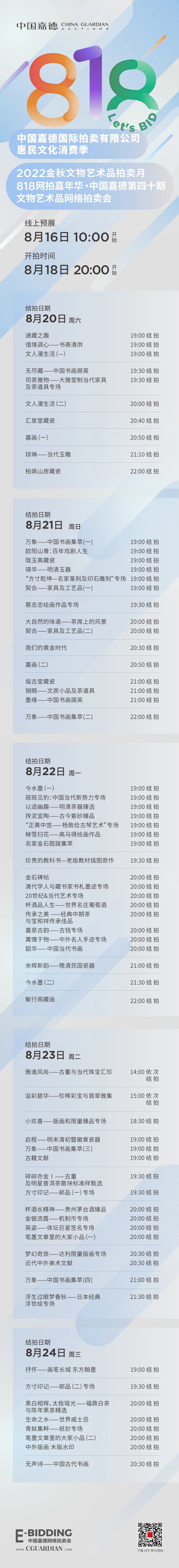 ●请您于参与拍卖活动当日24小时前完成账户注册并交纳保证金。●E-BIDDING提供预约鉴赏服务,敬请关注“中国嘉德网拍”服务号预约。鉴赏地点:嘉德艺术中心B1、B2层(北京市东城区王府井大街1号)。●中国嘉德为竞买人提供查看拍卖标的实物的条件,务请竞买人亲自审看。本公司对拍卖标的不承担瑕疵担保责任。请拨打1501000622015910807786![]()