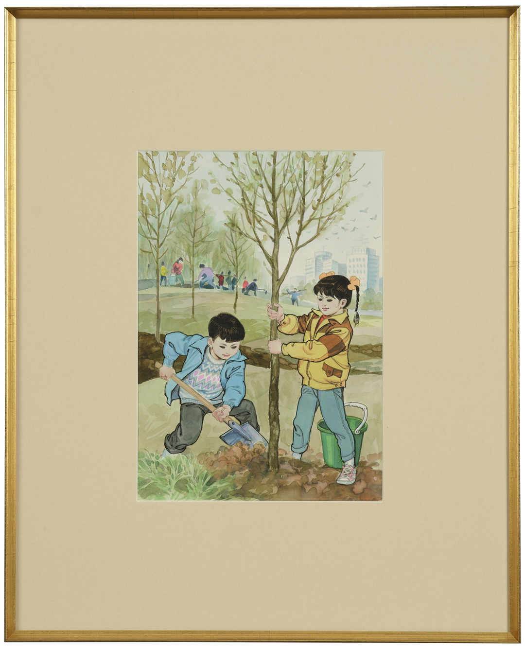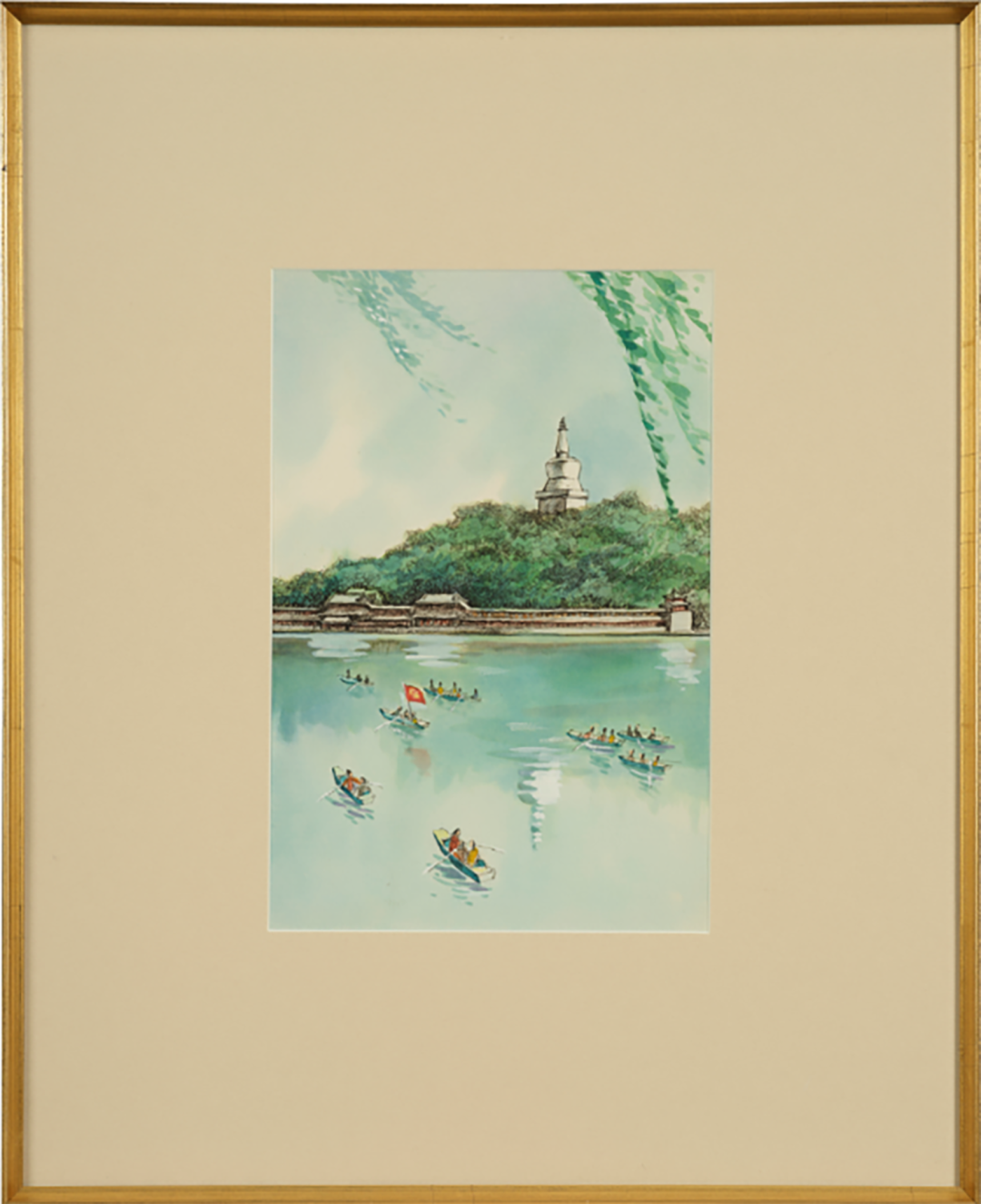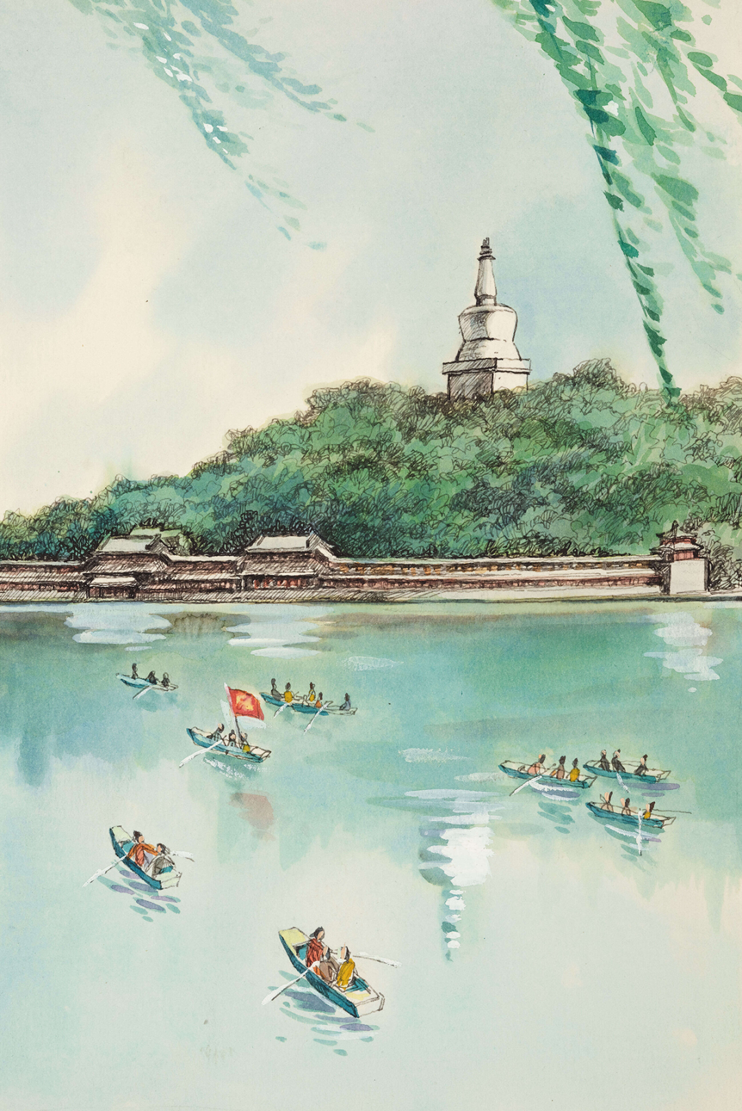 乔羽先生作词的《让我们荡起双桨》承载了80后、90后的童年记忆,北海公园的白塔也成为了众多北京中小学生们春游、秋游的打卡目的地。王惟震正是这幅深入人心的教材插图创作者。在70年代参加中国美展的王惟震是人教社的老作者,“少年闰土”“李雷”“韩梅梅”这些经典形象都出自他的笔下。Lot14557