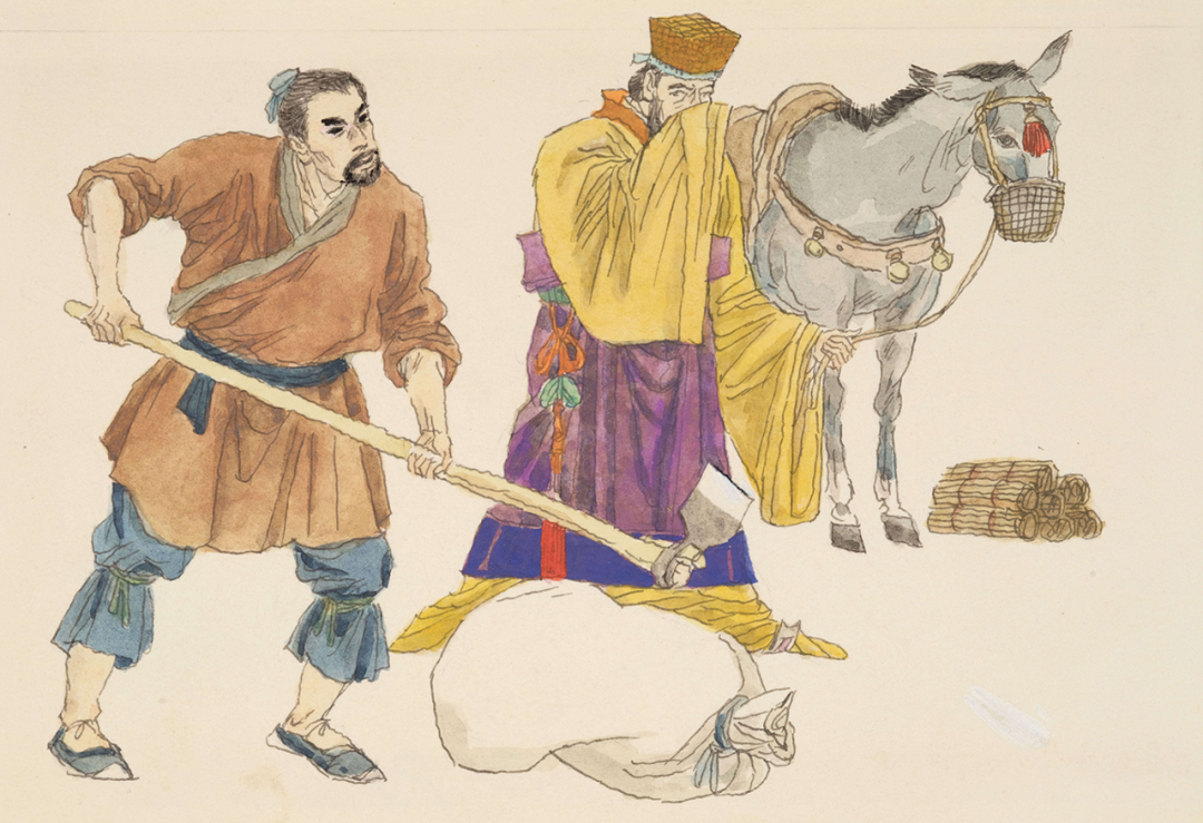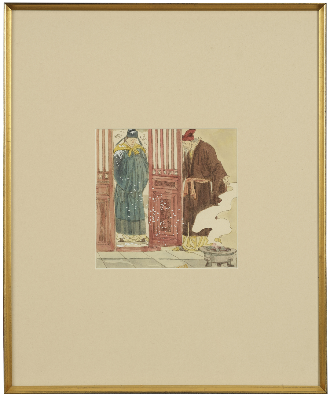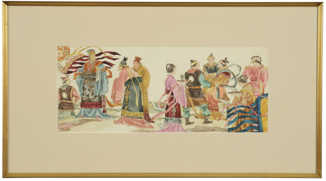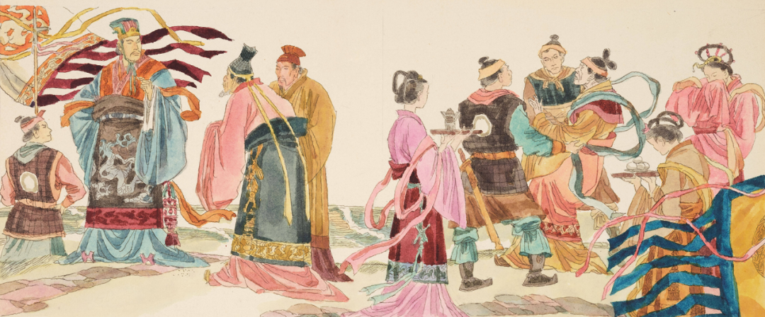这幅插图描绘西门豹惩治巫婆官绅,破除迷信,劝教众人的经典场景。擅长连环画、文学书籍插图的于绍文先生运用熟练的人物塑造技法,塑造了众人相的大场面。线条奔放灵动,色彩恬静典雅。