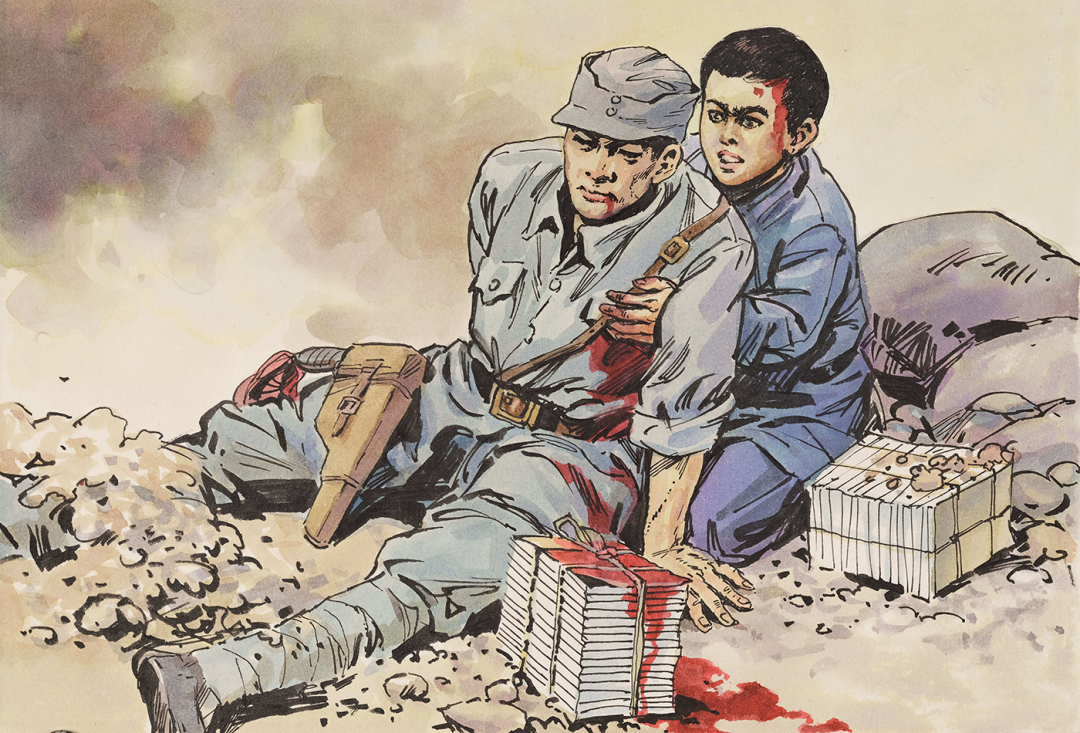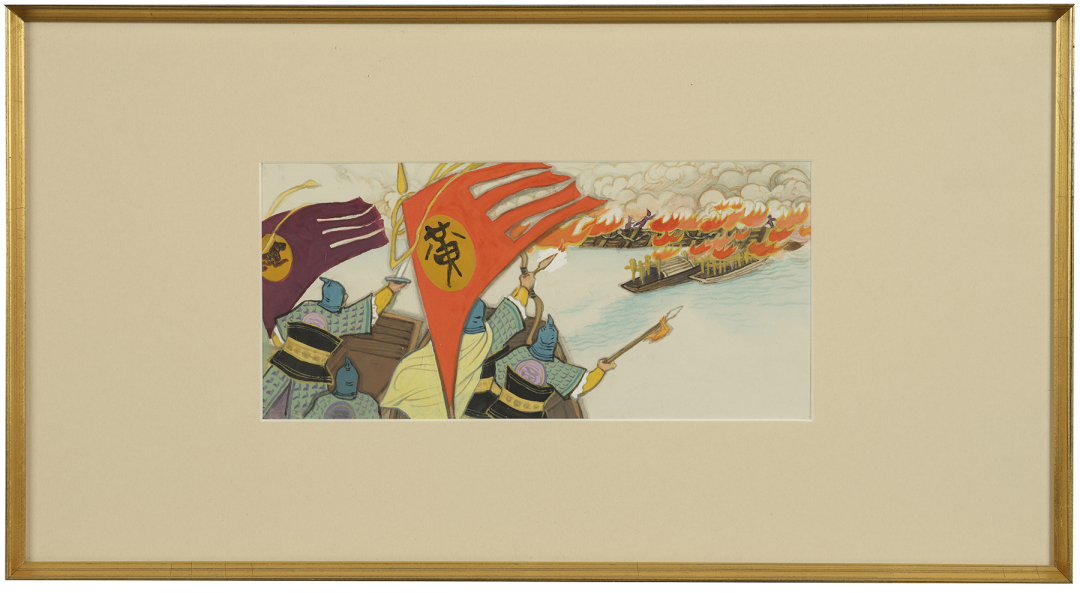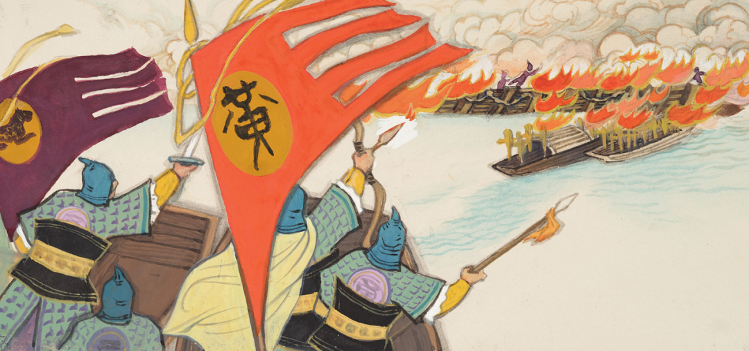 《赤壁之战》的插图刻画了黄盖叫兵士把二十船芦苇一起点着,让小船顺着东南风冲进曹操船队的战争场面。画面精炼几处细节,用被风撑起的军旗和硝烟凸显紧张战争场面,运用线描把人物动势画得生动而富于表现。