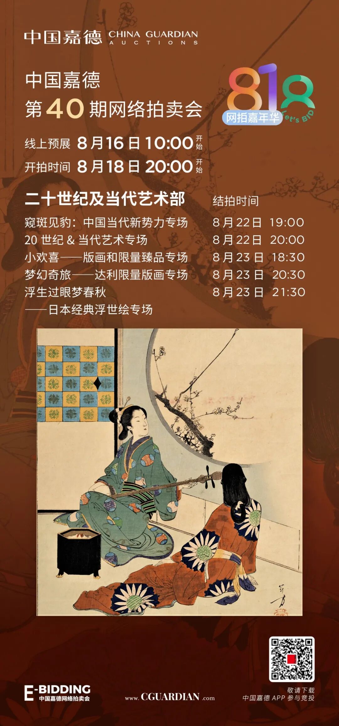 ●请您于参与拍卖活动当日24小时前完成账户注册并交纳保证金。●E-BIDDING提供预约鉴赏服务,敬请关注“中国嘉德网拍”服务号预约。鉴赏地点:嘉德艺术中心B1、B2层(北京市东城区王府井大街1号)。●中国嘉德为竞买人提供查看拍卖标的实物的条件,务请竞买人亲自审看。本公司对拍卖标的不承担瑕疵担保责任。请拨打1501000622015910807786![]()