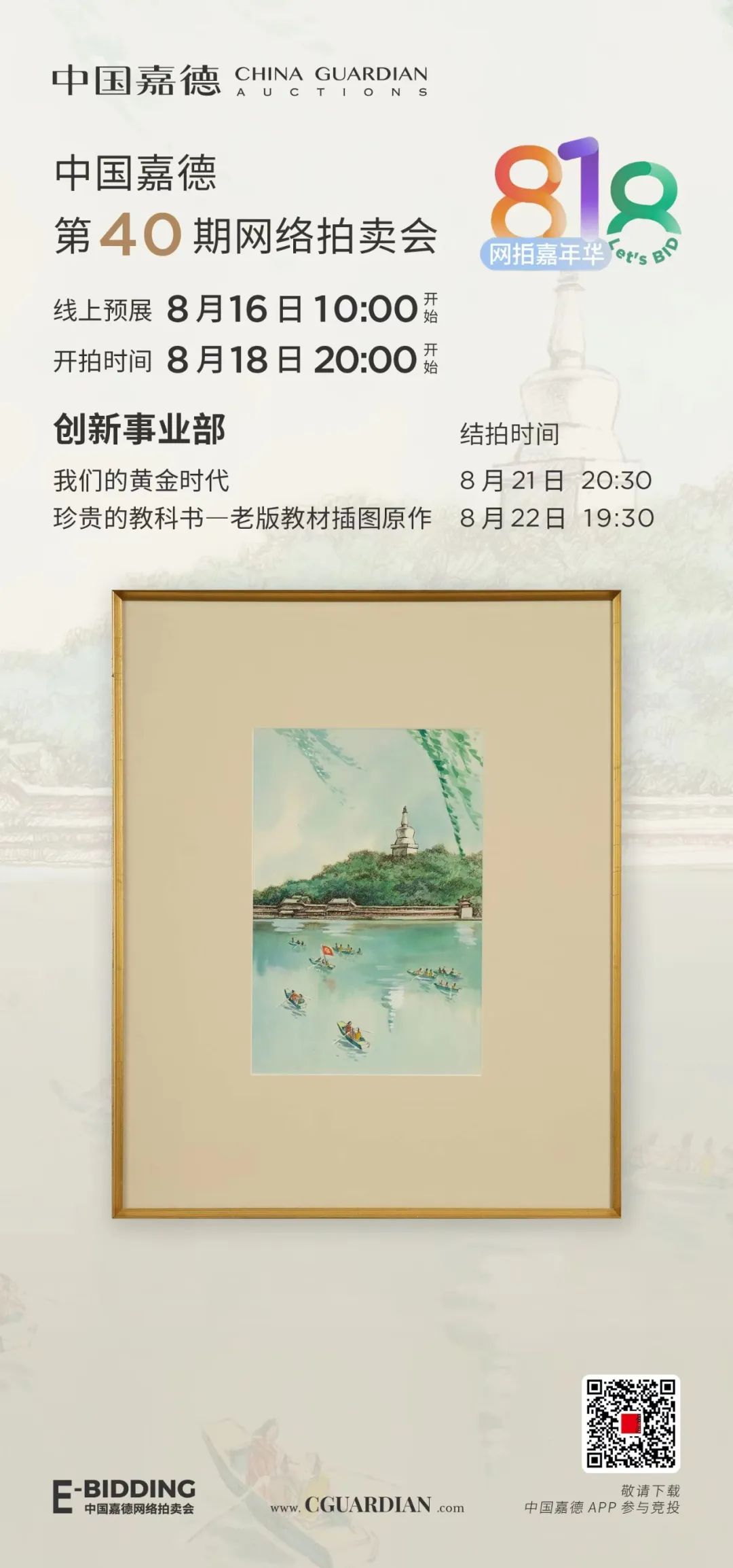 ●请您于参与拍卖活动当日24小时前完成账户注册并交纳保证金。●E-BIDDING提供预约鉴赏服务,敬请关注“中国嘉德网拍”服务号预约。鉴赏地点:嘉德艺术中心B1、B2层(北京市东城区王府井大街1号)。●中国嘉德为竞买人提供查看拍卖标的实物的条件,务请竞买人亲自审看。本公司对拍卖标的不承担瑕疵担保责任。请拨打1501000622015910807786![]()