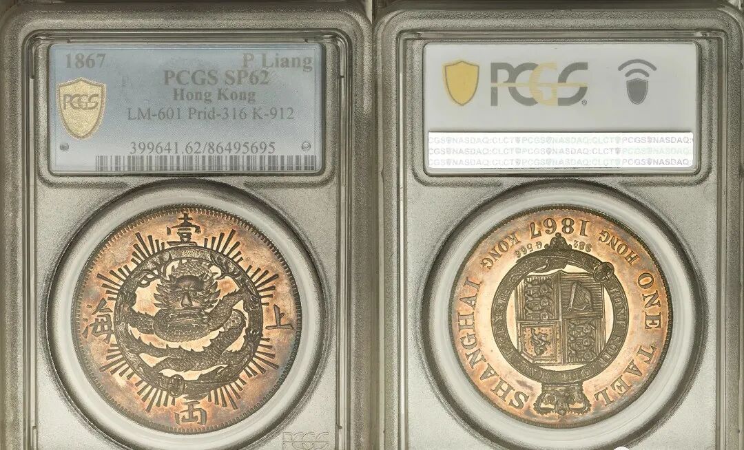 1867年上海壹两银币,有射线版,周沈谱编号:Tael HKS.1.2,此币正面龙纹,光芒自中心向外辐射,背面为英国王室及嘉德勋章图案,图案设计精美绝伦,镜面底版,边齿及马齿锐利,龙鳞满打,立体感极强,原味欧洲五彩包浆,品相顶级,此币为中国机制银币顶级大纲目性名誉品,存世仅数枚,向为藏家所珍爱,极为难得罕贵,金盾PCGS SP62