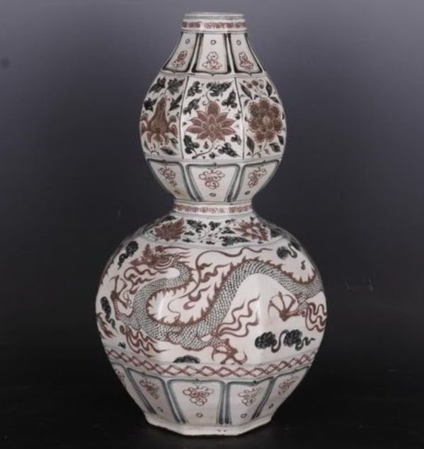 明 青花釉里红穿花龙纹八方葫芦瓶