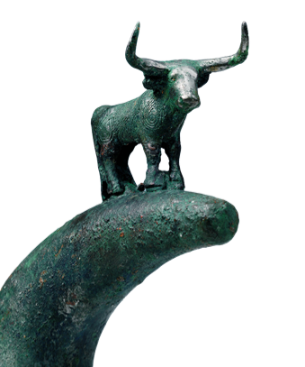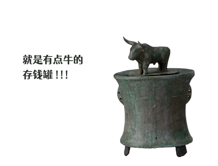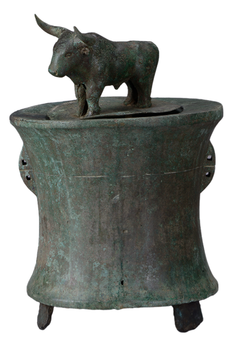 束腰圆筒形贮贝器,三足,器身素面无纹,有对称的双耳,器盖中央雕铸一立牛,膘肥体壮,其犄角长且弯。