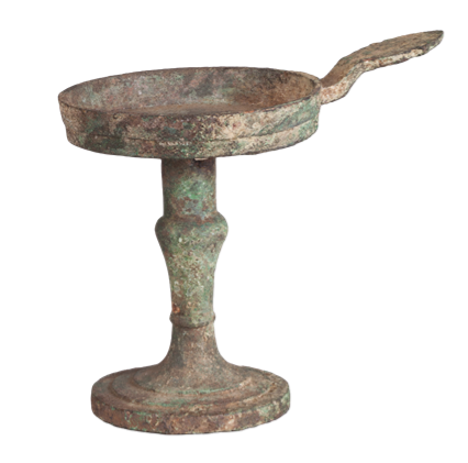 豆形灯,由灯盘、灯柱和灯座三部分组成。灯盘浅,直腹平底,有一鋬;灯柱上部呈圆柱状,下部弧鼓略束套接;喇叭形底座,底座有圈足。