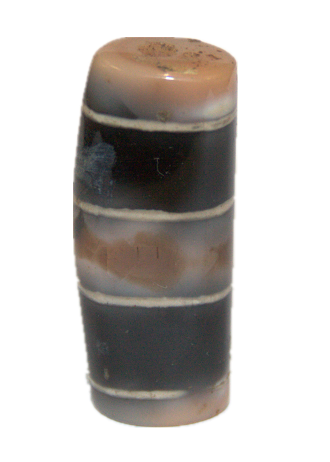 这件蚀花石髓珠为扁圆柱形,4条白色线纹将珠子分为5段,1、3、5段为肉红色,2、4段为黑色。有2个穿孔,正中的穿孔较大,旁边有个较小的穿孔。蚀花石髓珠的制作方法是用一种野生白花菜的嫩茎捣成糊状和以少量洗涤碱的溶液,调成半流体状的浆液,用笔蘸之,绘于磨制好的肉红石髓珠上,熏干后将珠子埋于木炭余烬,约五分钟后取出。冷却后,用粗布疾拭,即得光亮的蚀花珠。西汉时期,云南已经具有生产蚀花珠的能力了,石寨山出土的铜鼓形蚀花珠即为明证。