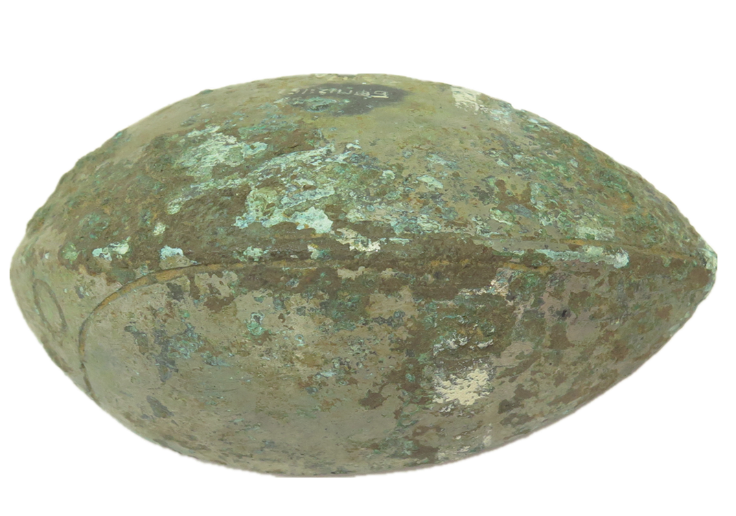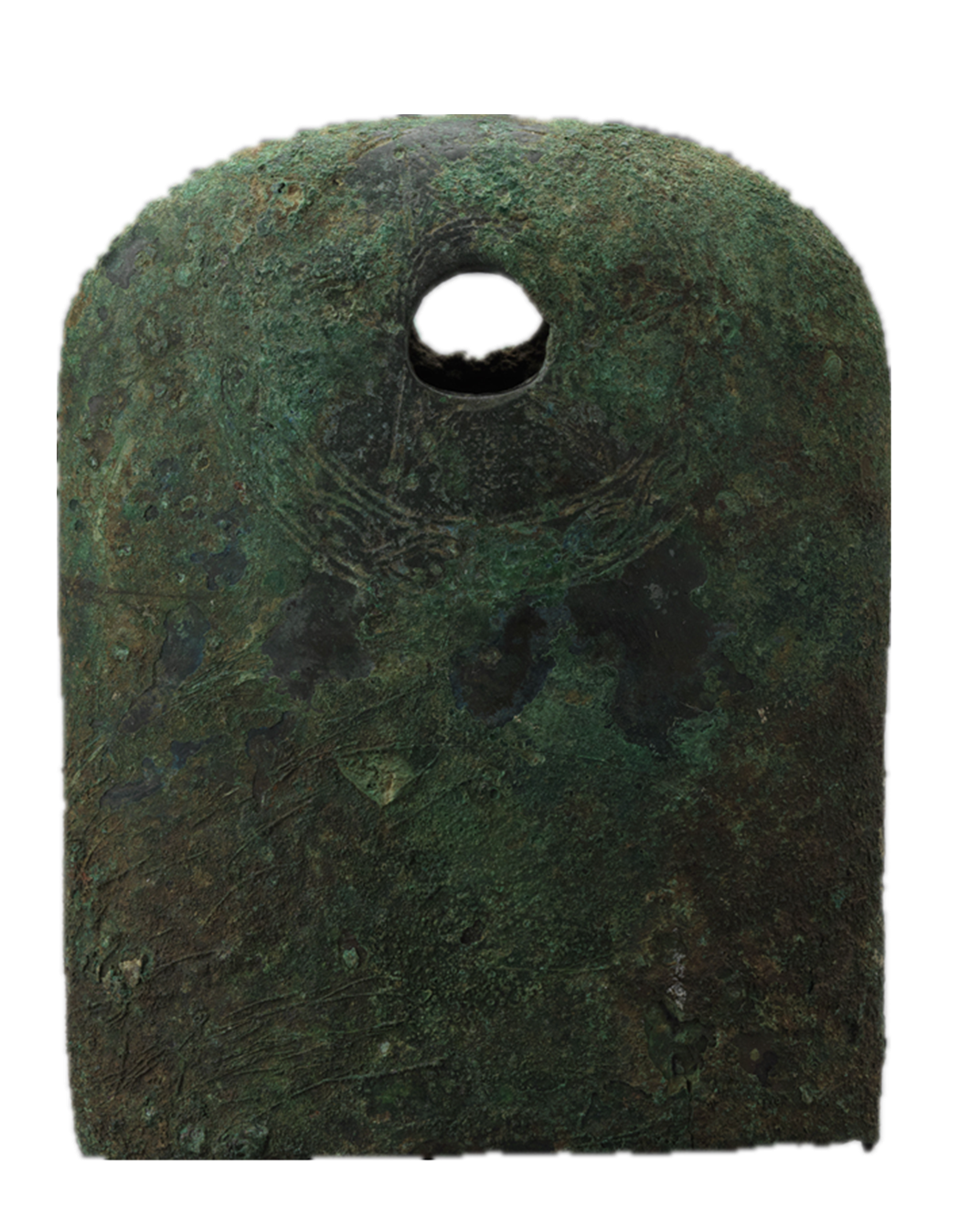 青铜铸造。扁圆体,顶上无钮,惟前后对穿一圆孔,以系带,有铜舌。