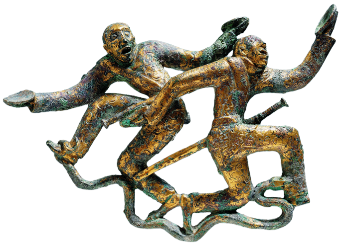 扣饰上这两名舞蹈者的服饰相同,头后梳条形小髻,高鼻、深目,着紧身裤,其上有圆形花纹。腰部束带,身侧佩剑,剑带悬于右肩。双手执圆盘,口微张,腿部弯曲,作边歌边舞状;其下有1条蛇,口咬前人之右足,尾绕后人之左足。整件扣饰造型生动有趣,动感极强。从两个舞蹈者的形象特征与装束看,应是异域来客,有学者认为他们是北方草原游牧民族“塞人”。此铜扣饰对于研究汉代的盘舞有很高的参考价值。