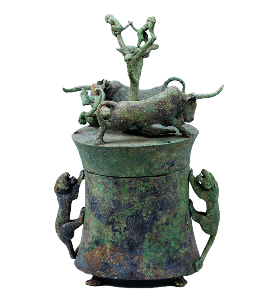 束腰圆筒形虎牛搏斗铜贮贝器,器盖上就是一幅二牛一虎激烈搏斗的精彩图景。虎趴在地面,张口嘶吼,左后腿被一牛角挑穿,另一牛极力闪躲虎爪扑抓,并伺机进攻,画面极富动感。器盖正中铸一四分叉树枝,最高的树枝两端各有一只猴,两猴背对,尾巴牵在一起,似瑟瑟发抖;另两根树枝顶端各有一只鸟,展翅欲飞。滇人艺术家用猴与鸟的造型生动巧妙的渲染出虎牛搏斗紧张的气氛,定格住最惊心动魄的一幕。虎虽为最凶猛的动物之一,但与牛搏斗,也不见得有十分的胜算。