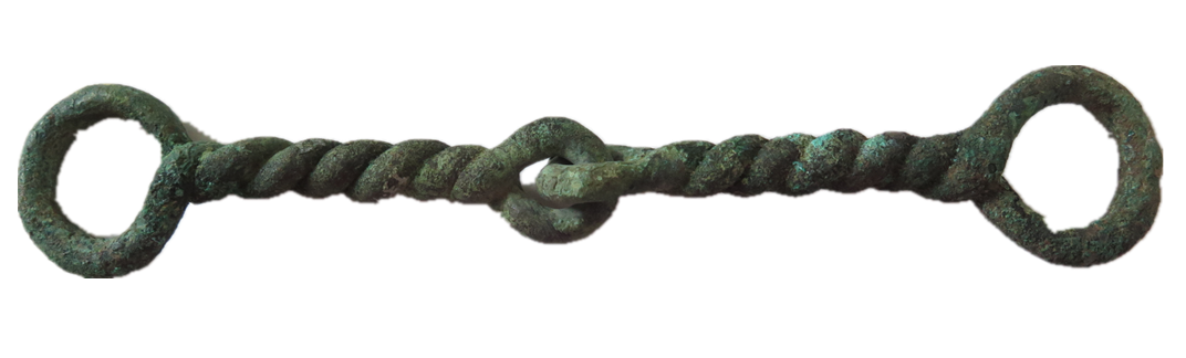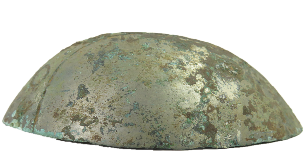 青铜铸造。正面阴刻蝉的眼睛及双翅,背面中空,边沿稍向内折,中段有两个对称的扁条形齿扣。