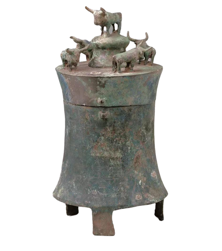 青铜铸造,器身作圆筒束腰形,子母口盖,各有对称双提耳,平底,三扁平足。器盖中央铸一鼓,上雕铸一立牛,周绕四牛皆低头垂尾作走动状。器身饰双弦纹。因专用于存放海贝而得名贮贝器,极具云南民族风格和地方文化特点,是滇国王侯贵族的专用品,象征着财富、地位和权力。