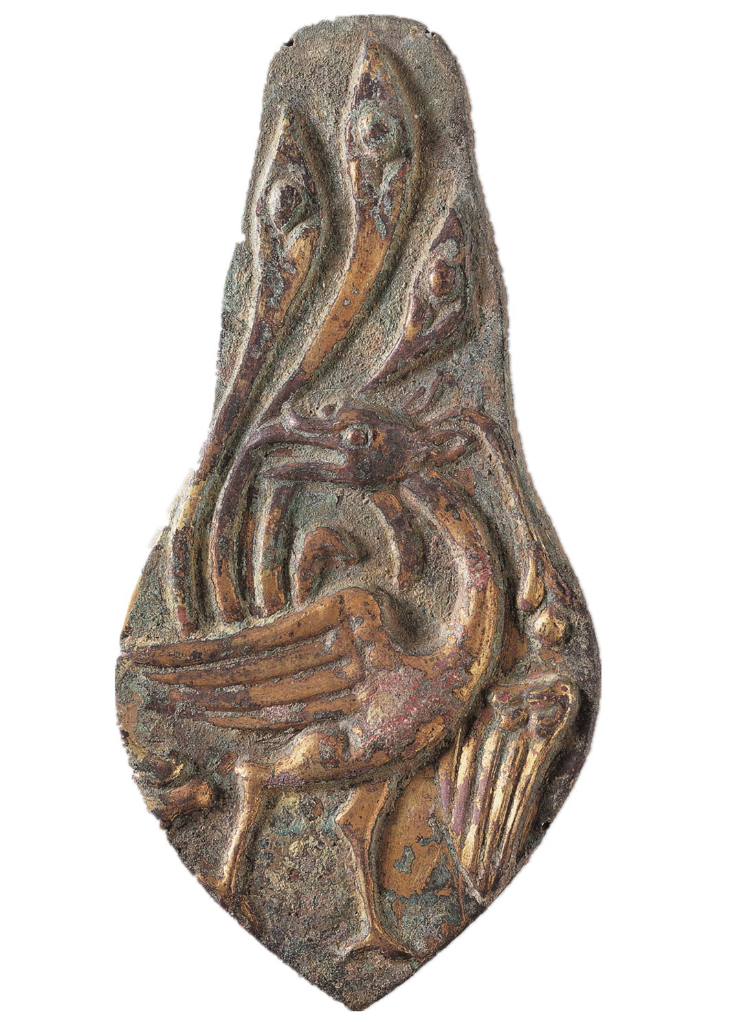 马珂是安装在马鞍后面之鞦带上的饰件。这件马珂青铜铸造,鎏金。形如鞋底,面上压出凸起的鸟形一只,其尾有眼,似孔雀,有双耳,作鼓翅侧首而鸣之状。