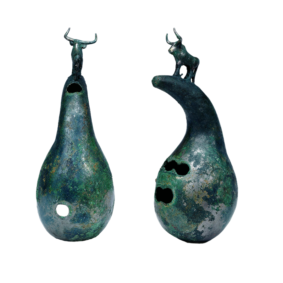 铜葫芦形笙曲管上段一侧有1圆孔,近顶端雕铸1立牛。笙下部正面开5孔,背面1圆孔。出土时笙腹内有残断的竹管痕迹,说明此笙原5孔处当插有竹管。这是古代滇人使用的一种吹奏乐器。葫芦笙现在云南彝、佤、怒、拉祜、傣、纳西、德昂等少数民族中仍有使用。