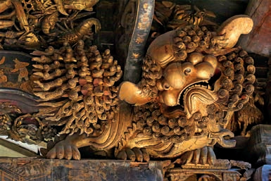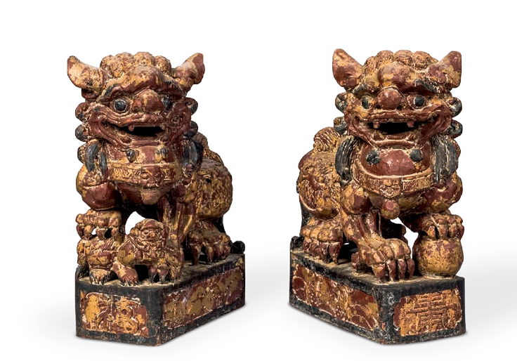 木雕狮子有单狮、双狮、四狮、五狮或九狮等。大狮与小狮的组合取其与“太师”“少师”的谐音,表达了步步高升、仕途无量的祈愿。四狮寓意四世同堂,五狮寓意五世其昌,九狮寓意长长久久。