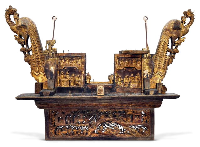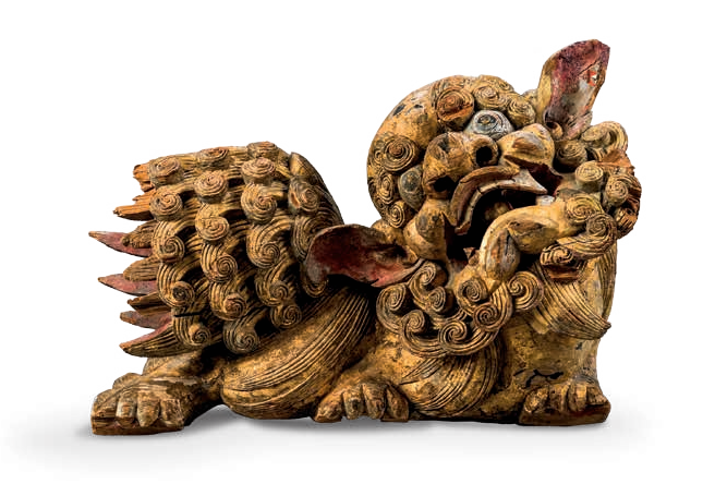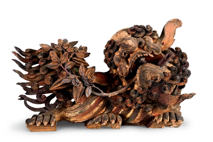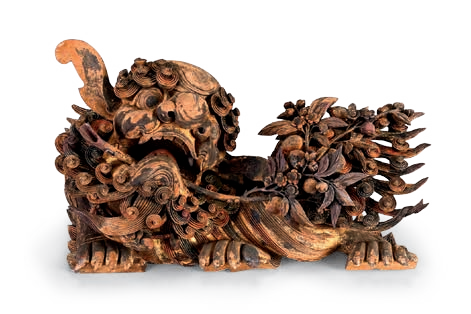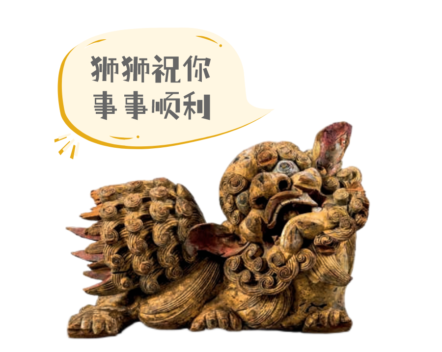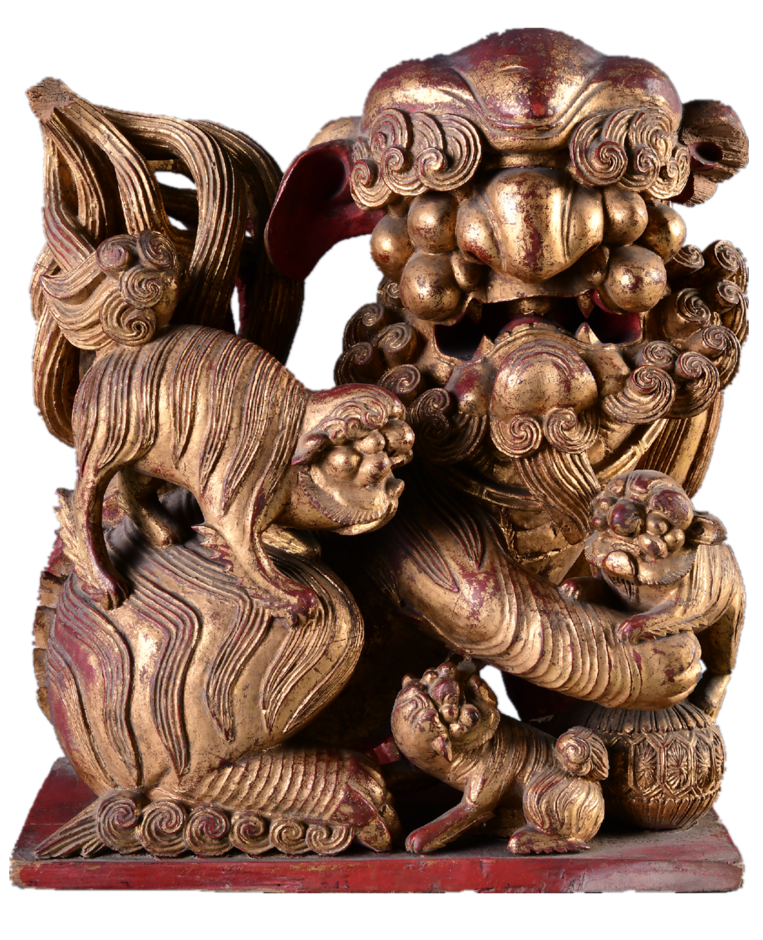 我国狮子的造型,始于东汉,盛于唐代,普及于明清。狮子在民间是瑞兽,可镇宅驱邪。岭南地区以狮为题材的木雕十分普遍,不仅出现于建筑构件上,也出现在馔盒、香炉、神龛、神轿等神器及牌匾、围屏等处,也可置于厅堂作为陈设。