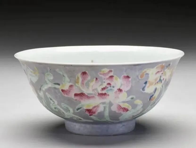 更有意思的是,对比同时期宫廷珐琅彩器物之发展,可见两者之间的不可分割性,自雍正六年《活计档》记录了怡亲王要求“造办处收貯的料内月白色,松花色有多少数目,尔等查明回我知道,给年希真烧磁器用”。这段文字说明了景德镇御窑厂至少曾经使用月白和松花两色珐琅料烧造瓷器。据此,对照唐英<陶成纪事碑记>(<陶务叙略碑记>1735中,有“洋彩器皿新仿西洋珐琅画法,人物、山水、花卉、翎毛,无不精细入神。”)的记载,更能明白雍正朝宫廷之中已将景德镇御窑厂烧造,风格与广州珐琅彩瓷相仿的一类作品称之为“洋彩”。同时,因唐英前往御窑厂监造烧瓷前,曾参与怡亲王主持的炼料计划,故可推测,也见于<陶成纪事碑记>中的“西洋黄色器皿”、“西洋绿色器皿”和“新制西洋紫色器皿”这三个品类,分别能与宫中画珐琅使用的“黄色”“绿色”和“深葡萄紫色”珐琅料相呼应,这些侧面反映出御窑厂烧造洋彩瓷器,是以追仿和广州珐琅彩瓷同等效果作为诉求烧造。从而证实两者之间不可分割、且同宗同源的关系。(图13、14为紫地珐琅彩花卉纹碗及胭脂红彩碗 台北故宫博物院藏)