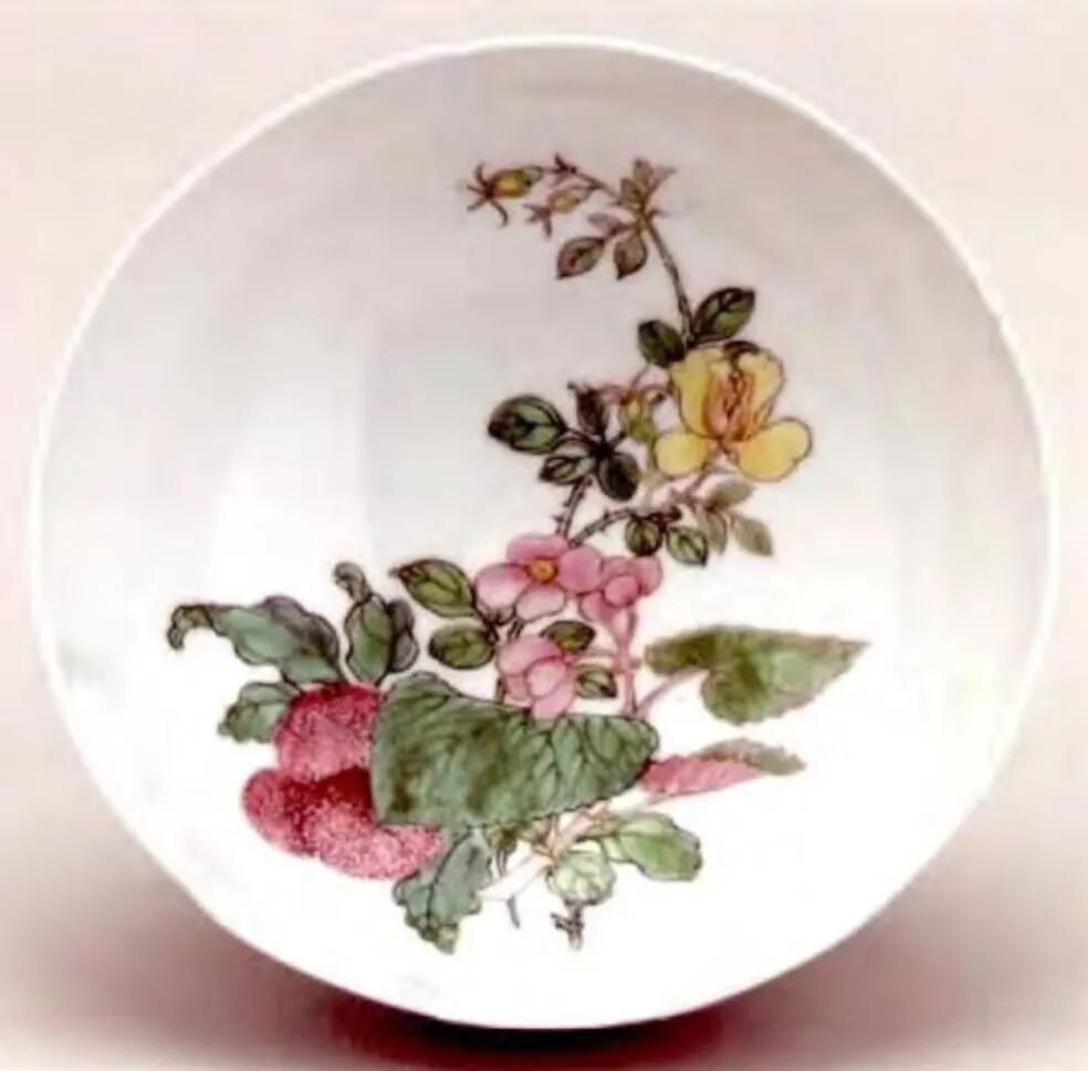 雍正皇帝关注红色珐琅料(实物可参看中贸圣佳拍品的胭脂红粉彩花卉图盘),其实与康熙朝画珐琅创烧之际尝试研发从西洋传入以金发色的技术密切相关。清宫刚开始试烧珐琅彩瓷时,必须在瓷胎上施涂原使用与金属胎上的珐琅料,当时造办外尚未能自行炼料,所以胭脂红早期一直依赖进口,价格非常昂贵,因而康熙、雍正两位皇帝锐意创新,冀望能创烧出属于中国本土的珐琅彩料,他们在宫中造办处珐琅作坊,由郎世宁主导的一些欧洲及广彩工匠试烧本土供宫廷使用的胭脂红釉,最终烧制成功。从金红这一釉色的烧造来看,无论是广彩中的胭脂色还是宫中烧制珐琅彩的胭脂色均模仿西方珐琅中的卡西乌斯紫。其具有异曲同工之特性。
