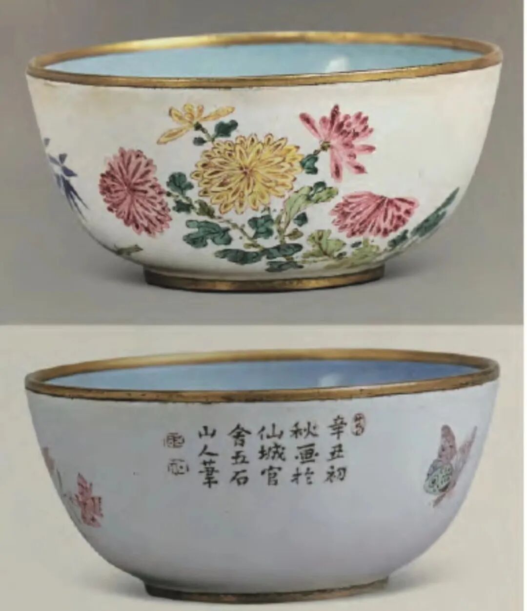 其为康熙时期进口珐琅料珐琅用于铜胎之上的典范,此两杯上分题:“辛丑署月偶写怡情官舍月峡渔父笔”及“辛丑初秋画于仙城官舍五石山人笔”。“辛丑”为康熙六十年(1721),这是目前所见唯一带有纪年和产地信息的康熙末年广珐琅制品。其绘画方式、稚拙的笔触,甚至上彩涂抹方式与早期应用于瓷胎上的广彩器物十分相似(如图2,台北故宫博物院藏清康熙 珐琅彩锦地团螭纹碗,“大明弘治年制”款。)(如图3,4为大英博物馆藏康熙洋彩花卉纹碗)可见其相互影响之特性。