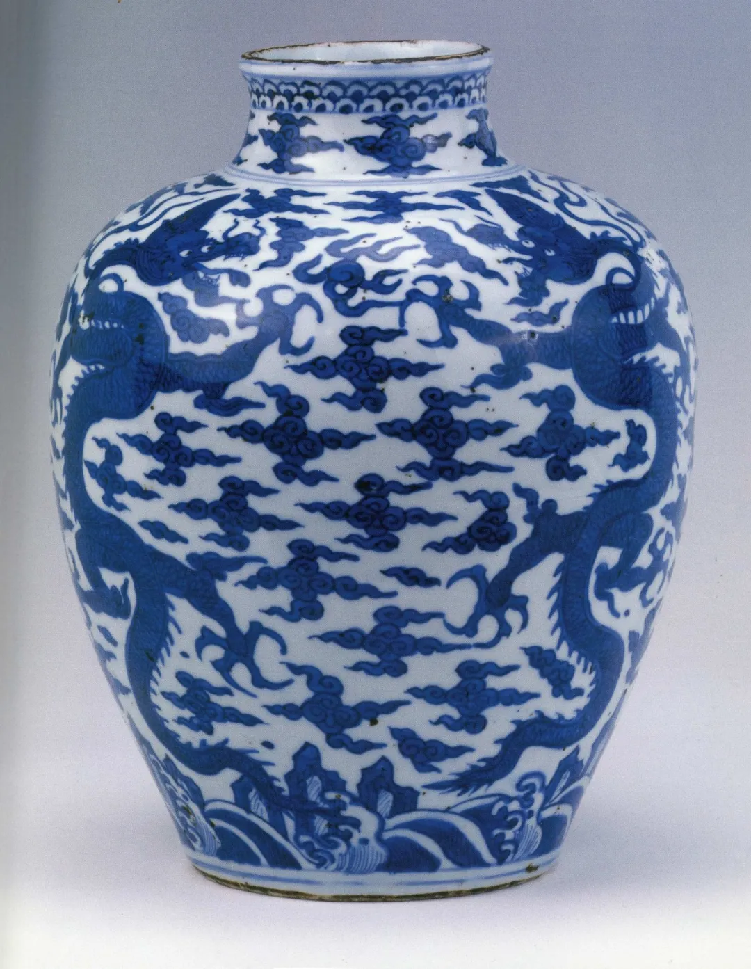 西藏博物馆内收藏着一只万历青花云龙纹罐,罐身上绘龙戏珠纹及“壬”字形云纹,画功扎实,色彩艳丽。有意思的是,罐底落款是“万历丁亥年造黔府应用”。落同款识的青花瓷罐,世上仅存三件。
