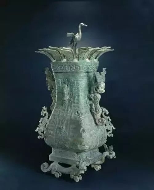 莲鹤方壶,高122厘米,宽54厘米,重64千克。方壶形体巨大,双层镂雕莲瓣盖上立有一只展翅欲飞、引颈高吭的仙鹤。镂空的双龙耳较大,上出器口,下及器腹。壶体四面以蟠龙纹为主体纹饰,并在腹部四角各铸一飞龙,圈足下以两只伏虎承器。