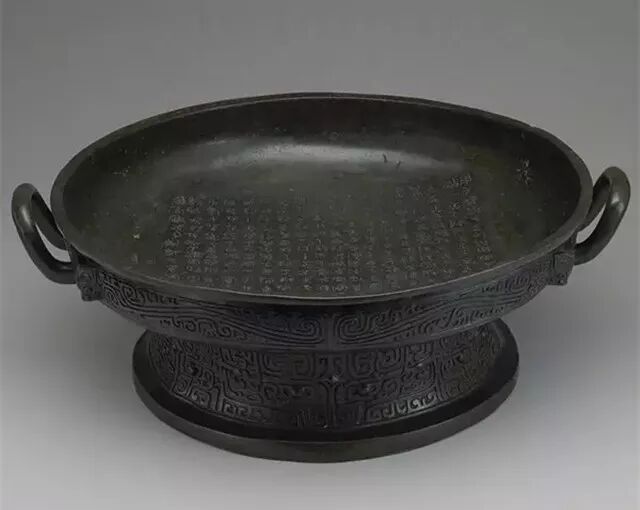 盘高20.6厘米,口径54.6厘米,盘底直径41.4厘米,重21.312千克,盘附耳,盘腹有夔纹饰,高圈足上饰兽面纹。内底铸有铭文19行、357字。内容为一篇土地转让契约,记述夨人付给散氏田地之事,并详记田地的四至及封界,最后记载举行盟誓的经过,是研究西周土地制度的重要史料。
