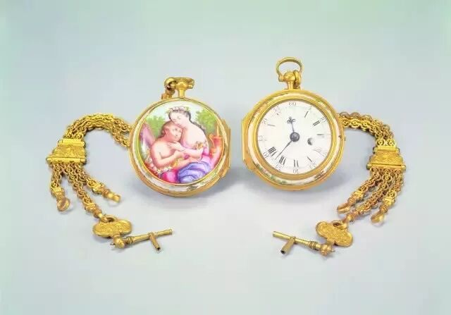 铜镀金画珐琅怀表,直径6厘米,厚3.8厘米。十八世纪中叶,英国伦敦的制表业巨欧洲之冠,此对怀表不仅见证了中西文化的交流,同时也展现了奇妙的机械精工。