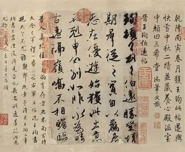 《伯远帖》是东晋著名书法家王珣书写的一封信,纸本,行书,纵25.1厘米,横17.2厘米。《伯远帖》上只存录王珣书信中的47个字,只言片语中似乎诉说着萦怀的回想和与友人天各一方的怅惘。此帖书迹俊逸流畅,劲健灵动,其结字缜密,而又大小参差,疏密有致,正是信手写来,更显风流之美。